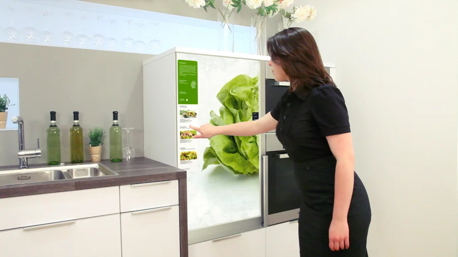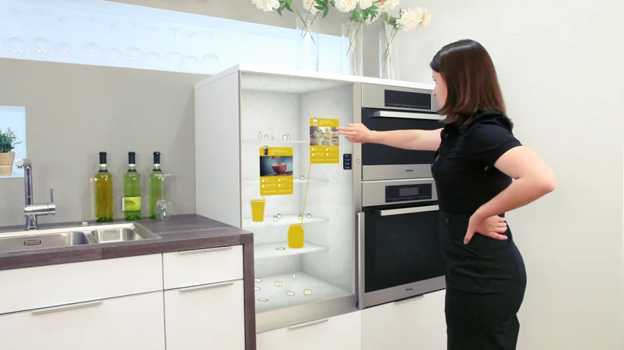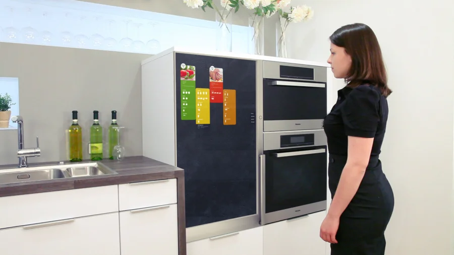 It deals with the process of food management in a futuristic scenario where RFID tags are printable. In this scenario, the data stored on the RFID tags is put at the users’ disposal by an interactive terminal. Naturally, the most useful area of application for this technology is the place where perishable goods are kept in – the refrigerator. The terminal has a large front which serves as a touch display to gain access to the desired information. Important information, such as soon decaying foods, are apparent at first sight. Thus the user doesn’t have to interact with the system to receive essential information – unless he chooses to do so. Additional information like a digital cook-book, shopping facilities or an indication for missing groceries is just a finger tip away. Hence, the refrigerator becomes an information terminal for food management. All information is available in one place and can be retrieved briefly. Through the connection with other kitchen equipment and nearby markets further services are opened. In order to proof the concept, we built a prototype which is able to display and to process an operation process.