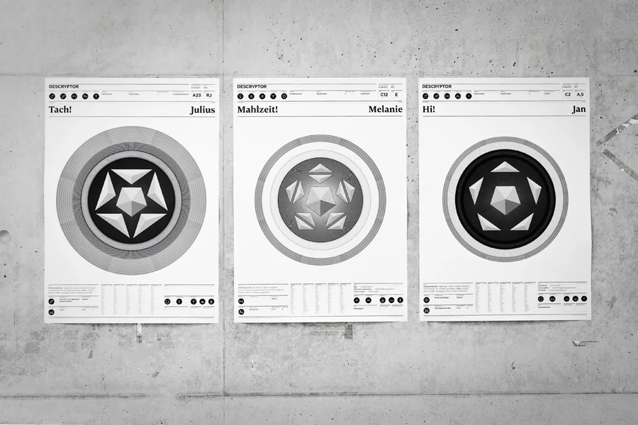 Descryptor ist ein interaktives System zur Erfassung und Visualisierung von Persönlichkeitsmerkmalen! Ein experimenteller Forschungsansatz, der als Diplomarbeit im Fachbereich Design der Fachhochschule Düsseldorf entwickelt wurde. Das System ermöglicht jedem Teilnehmer die Erstellung eines individuellen Profil-Plakates, das als Kommunikationsmedium der eigenen Persönlichkeit dient.