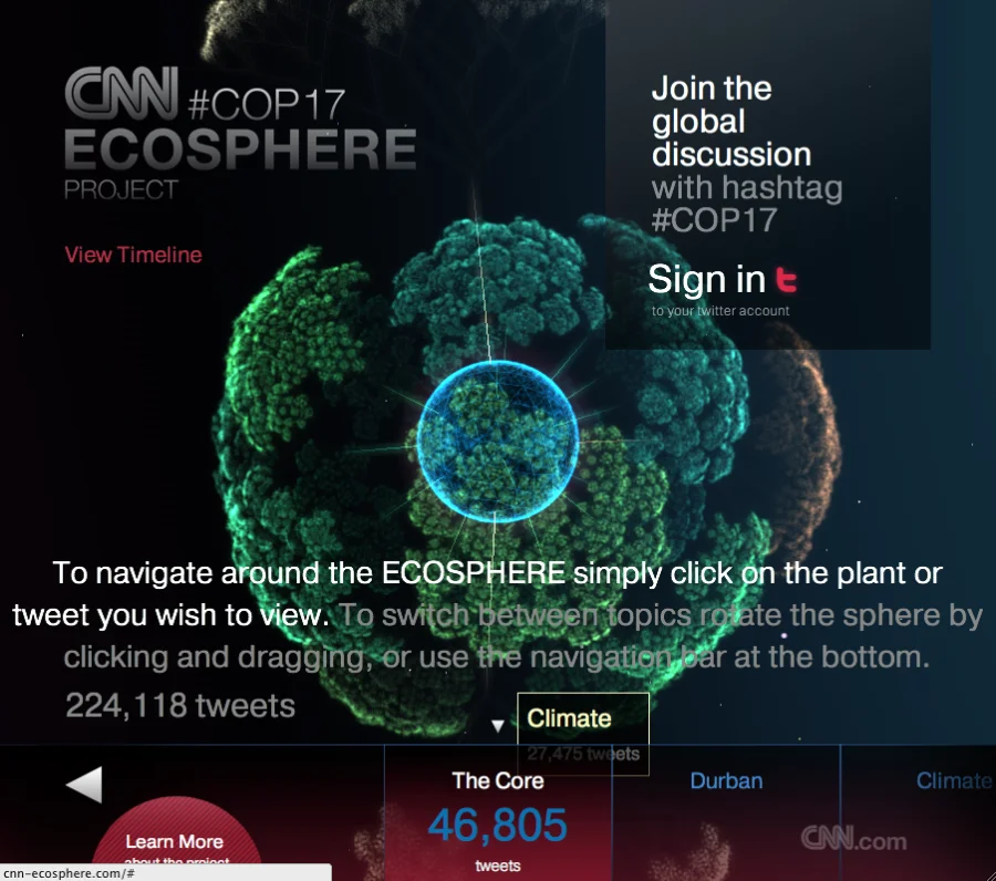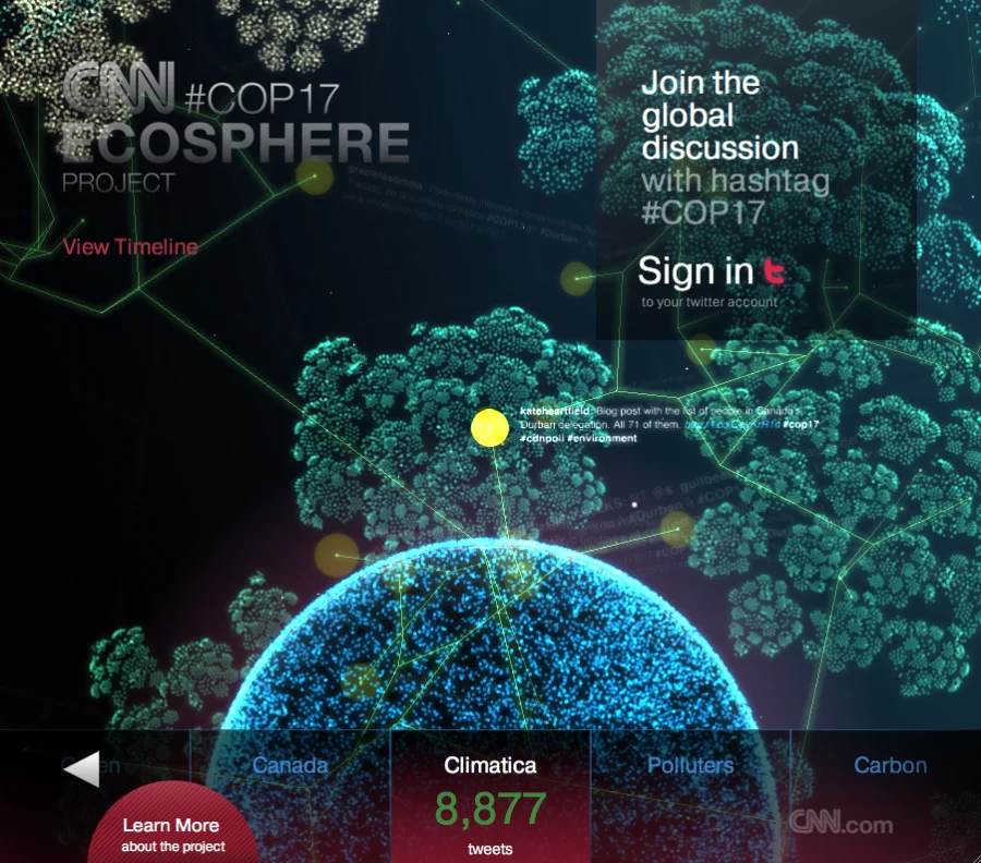 The Ecosphere constantly listens to the global conversation on Twitter – every new tweet tagged with hashtag #cop17 is brought into the system, scanned for keywords and then grouped with similar contributions, connecting input from around the world – building conversations in a fascinating evolving environment.