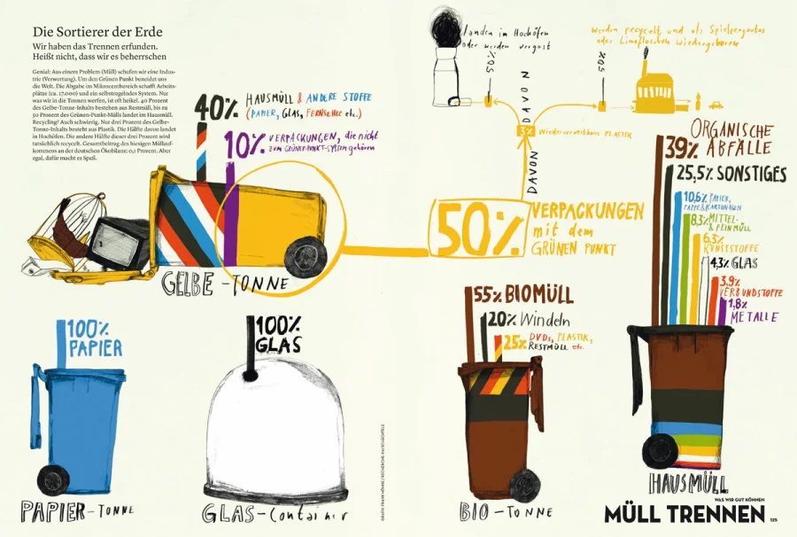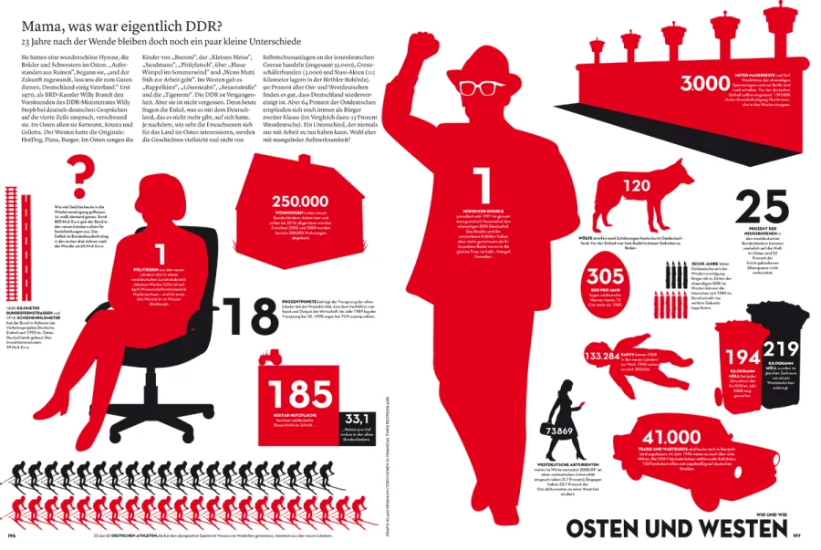 Es nimmt dabei den »typischen Deutschen« infografisch aufbereitet unter die Lupe: Was wir essen (825 kg pro Jahr), wie wir lieben (durchschnittlich hat der Deutsche 2x Sex pro Woche), wieviel wir trinken (durchschnittlich 111,7 Lite Bier pro Jahr) usw.