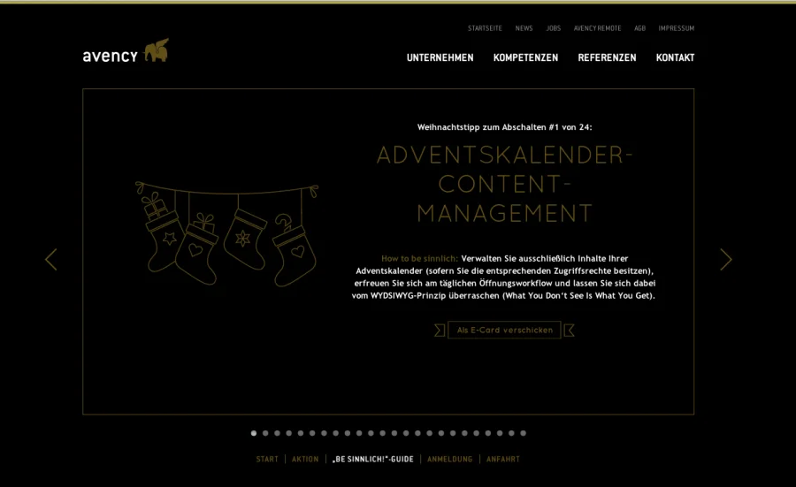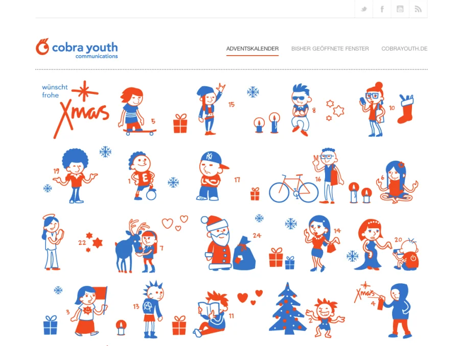 Cobra Youth communications ist eine Agentur für Kinder-, Jugend- und Familienmarketing und zeigt wie man eine Weihnachtsaktion mit nützlichem Fachwissen füllen kann. Auch hier wieder ein Adventskalender öffnet sich jeden Tag eine Tür, die sich bestimmten Themen widmet wie »Umgang mit Geldgeschenken«, »Datensicherheit und Netiquette« oder »Online-Marketing«. Dabei kommt u.a. die Zielgruppe zu Wort und nebenbei bekommt man einen ganz guten Überblick über das was Cobra Youth eigentlich macht.
