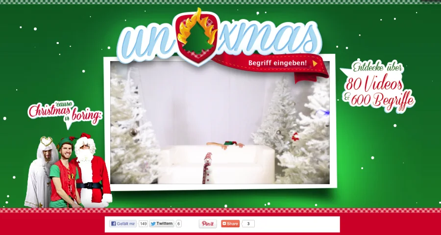 Über einen Eingabeschlitz im Logo, erhält der User die Möglichkeit (un)weihnachtliche Begriffe einzugeben, um somit ein Video der Protagonisten Weihnachtsmann, Christkind, Elf & Rentier freizuspielen. Vom guten alten Rolf Zuckowski-Klassiker bis hin zum Erlkönig, von Köln (über Düsseldorf) bis Bielefeld und Berlin, ob rot, ob grün – in über 80 kurzweiligen Videoclips toben sich die vier Charaktere schauspielerisch aus. Auf Basis eines WordPress-Themes wurden die Videos mit über 600 mehr oder weniger weihnachtlichen Schlüsselwörtern verknüpft, um ein breites Spektrum an möglichen Eingaben abzudecken. Und weil es doch mehr Wörter gibt als die die dort verknüpft sind, gibt es ab und an Tips was man eingeben kann.