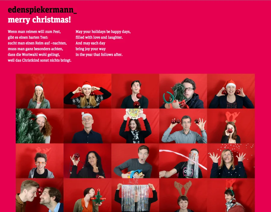 EdenSpiekermann gestaltet mit allen Mitarbeitern eine kleine Weihnachtskarte, auf der alle lustige Gesichter machen dürfen (Ja, Erik ist auch dabei). Zugleich noch eine Homage an das (Animierte) GIF, das ja unlängst 25 wurde.