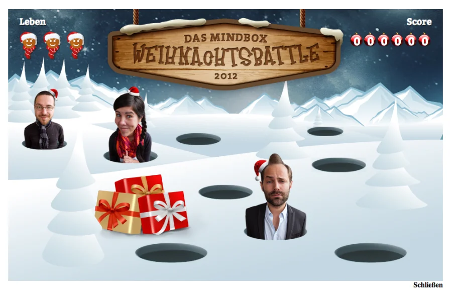 Bei Mindbox gibt’s in diesem Jahr etwas auf die Mütze und zwar auf die der Mitarbeiter. Ähnlich wie beim bekannten Whack-a-mole-Game aus den Siebzigern müssen Spieler dabei Figuren, die abwechselnd aus einem der vorhandenen Löcher lugen, mit Hilfe eines Holzhammers in ihre Deckung zurückbefördern.