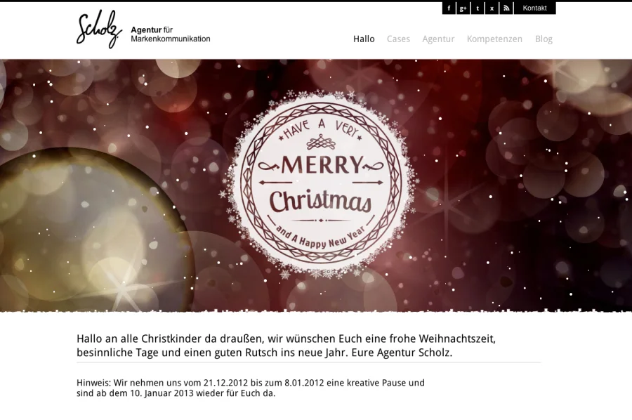Die Agentur Scholz verziert die eigene Website mit etwas Parallax-Scrolling und einem Video weihnachtlich und kündigt gleichzeitig Betriebsferien an.