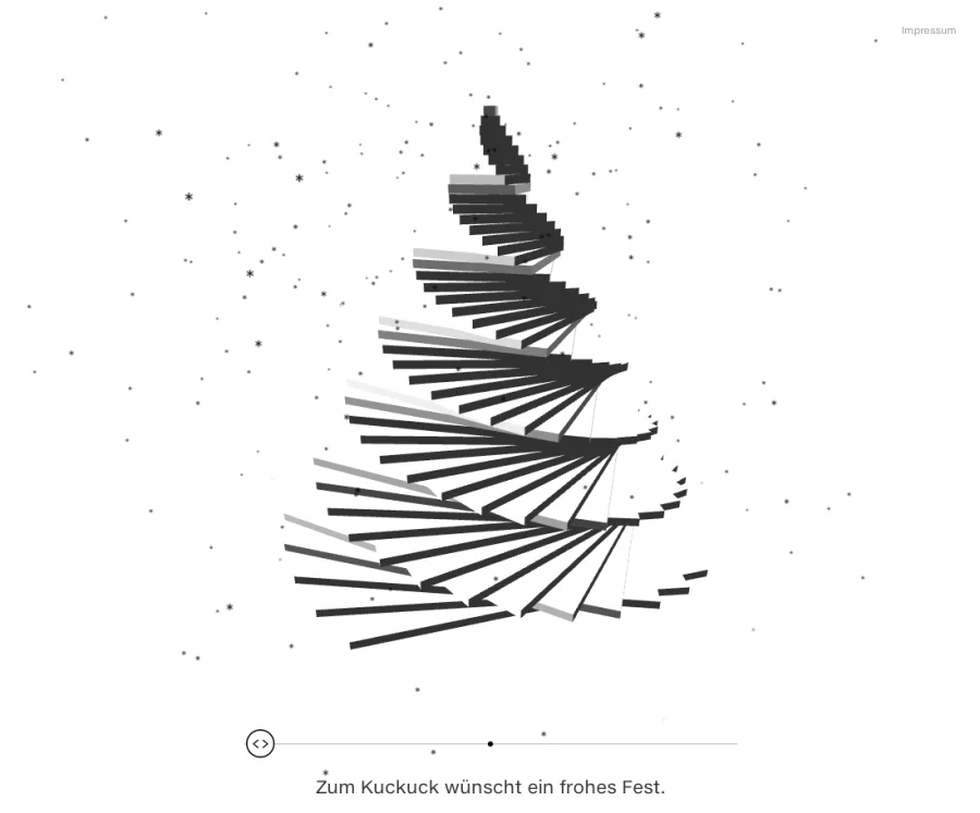 Die Agentur Zum Kuckuck hat eine wahrhaft interaktive Weihnachtskarte gestaltet, die sich als Slider entfaltet und einen Weihnachtsbaum zu Tage bringt. Ganz im Dmig-Stil ist sie in Schwarz und Weiß gehalten.