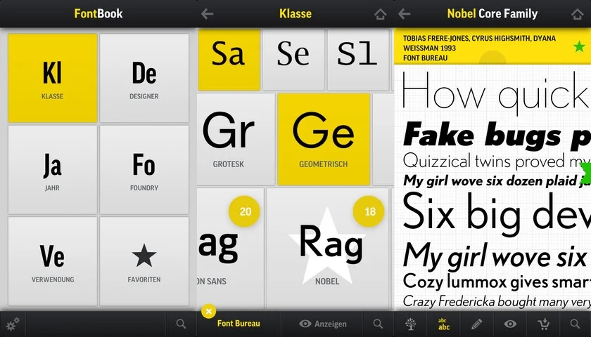 Damit vollzieht sich die Transformation von einem drei Kilo schweren Buch, über die App fürs iPad zur kleinsten (und günstigsten) Version. Für die Kleingeräte haben die Entwickler der Font-Enzyklopädie zusätzlich eine völlig neue Benutzerführung gegeben.