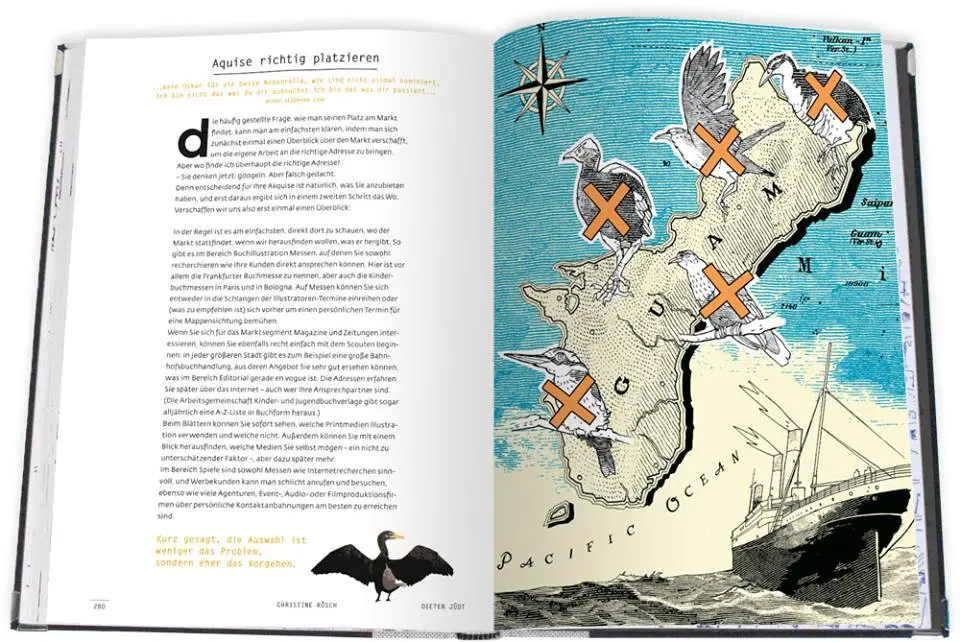 Ich erkläre Dinge wie die Künstlersozialkasse, wie Berufsverbände, den Umgang mit Nutzungsrechten , aber auch schlicht und ergreifend wie man zu Jobs kommt. Auch Akquise, Verhandlungsstrategien und Honorartabellen erscheinen mir unerlässlich um als Illustrator Erfolg zu haben.