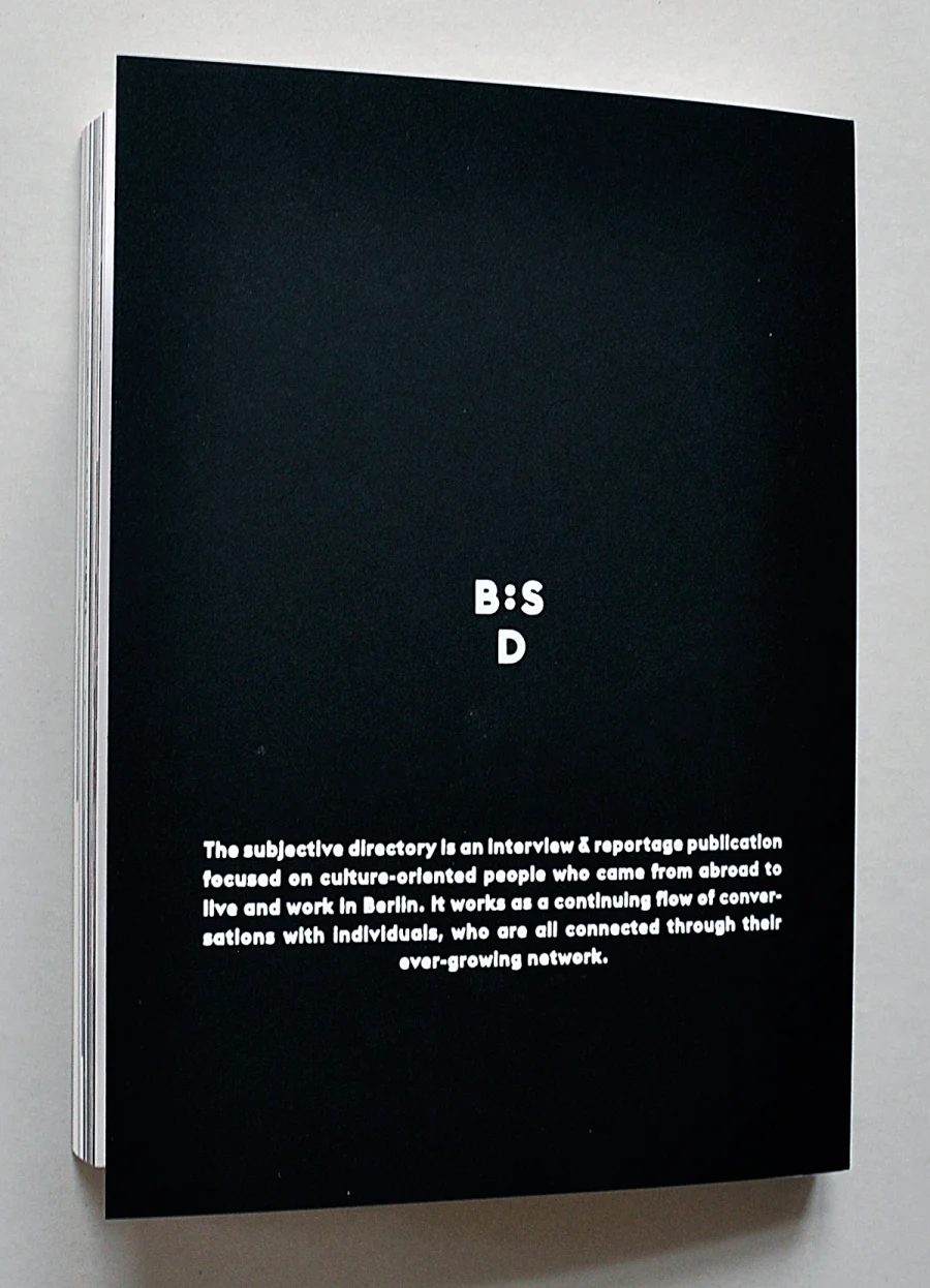 The subjective directory is an interview & reportage publication focused on culture-oriented people who came from abroad to live and work in Berlin. It works as a continuing flow of conversations with individuals, who are all connected through their ever-growing network.