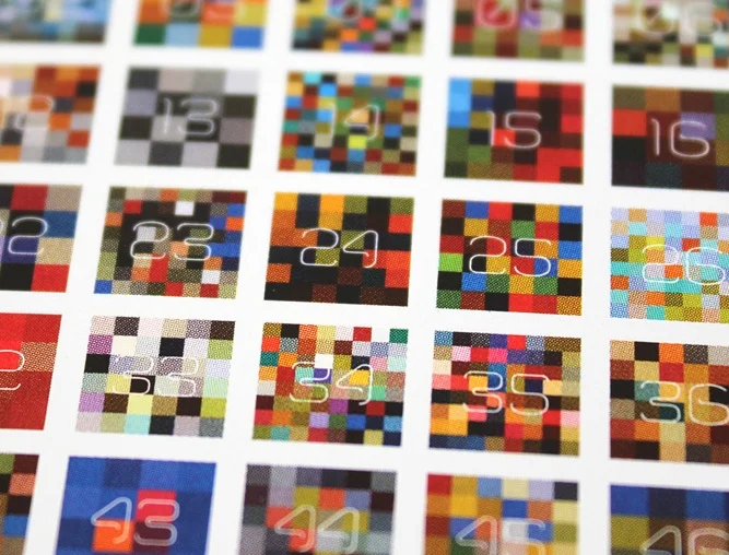 Für die von Nancy Crow kuratierte Ausstellung »Color Improvisations« wurden alle 50 Exponate in DNA-Blöcke übersetzt, die auf Eintrittskarten, Merchandising und im Katalog als »Leitsystem« verwendet werden.
