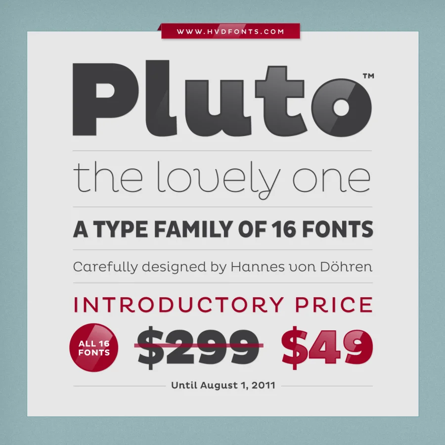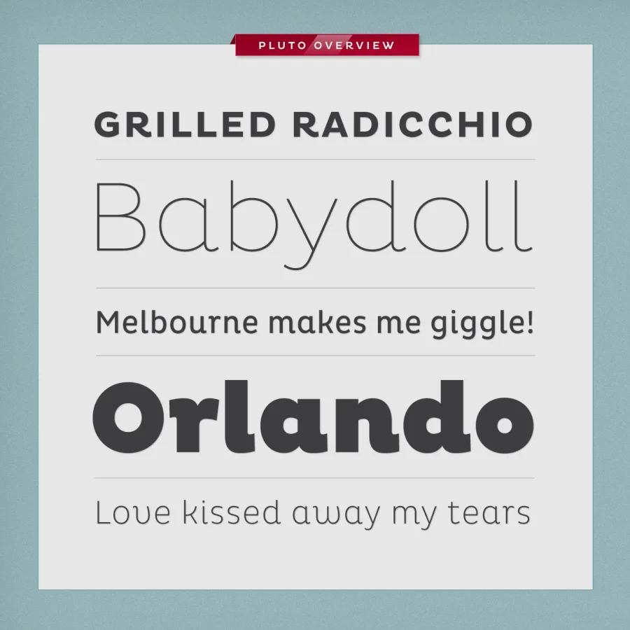 Type designer Hannes von Döhren has created Pluto, a sweet type family consisting of 16 fonts. The fonts are informal and friendly at first sight and lend themselves to display settings, however the straight and upright architecture of Pluto also makes it perfect for longer copy. Because of its large x-height, it even performs nicely in very small sizes. This contemporary type family is ideal for use in retail, cosmetics, food and hospitality applications and advertising.