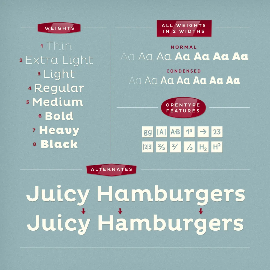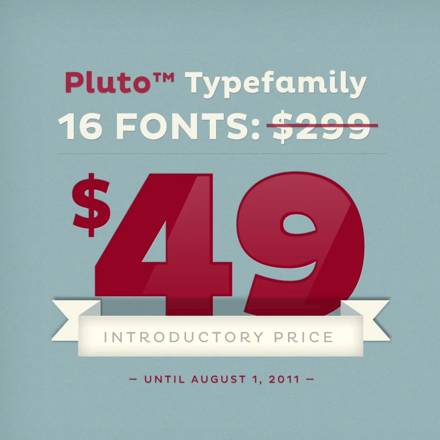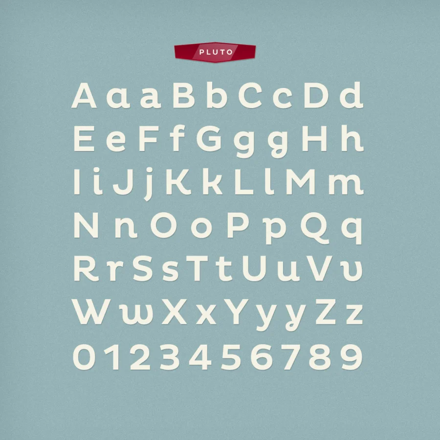 Pluto is equipped for complex, professional typography. The OpenType fonts have an extended character set to support Central and Eastern European as well as Western European languages. Each font includes alternate letters, fractions, lining-, tabular numbers, scientific superior/inferior figures and a set of arrows.