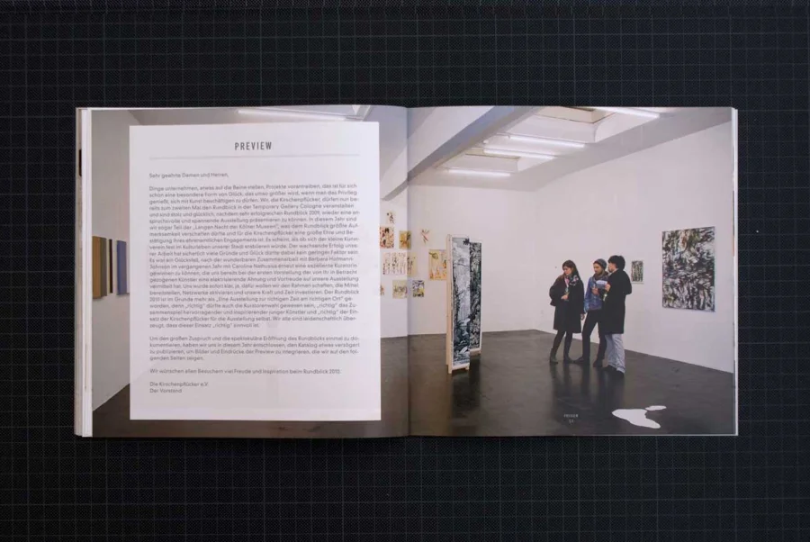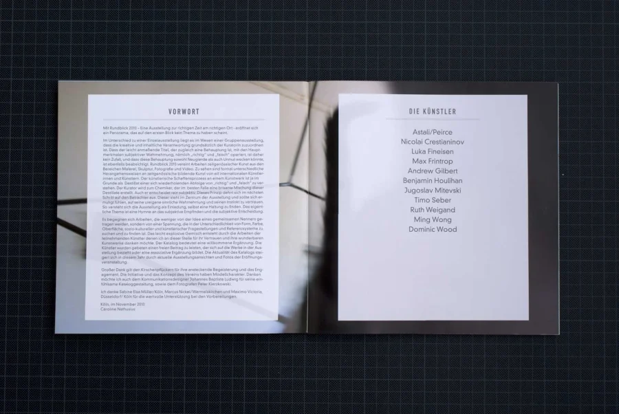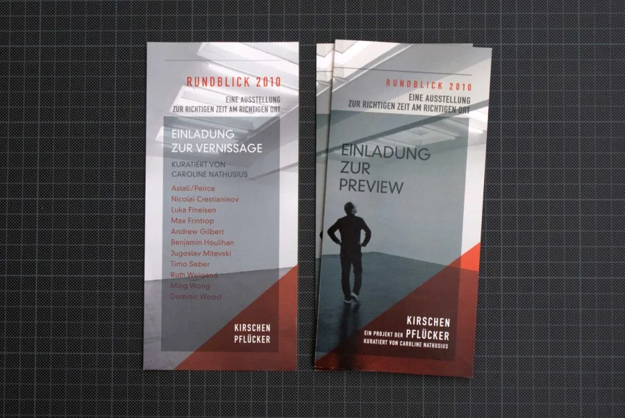 Design der Printmedien zur jährlichen Veranstaltung Rundblick, der Kirschenpflücker e.V. in der Temporary Gallery Cologne. Fotografien Peter Johann Kierzkowski.
