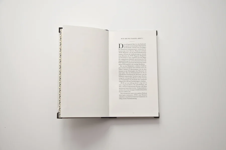 Das vorliegende Buch ist das Endresultat unseres zweimonatigen Experiments auf Facebook, welches sich aus folgenden Elementen zusammensetzt: erstens der Inszenierung eines fiktiven Magazins namens »WTF-Magazine« auf der Internetplattform Facebook, zweitens der Aufforderung zur interaktiven Mitarbeit der »WTF-Magazine«-Mitglieder auf Facebook an den angeblich für das Magazin vorgesehenen Inhalten und drittens der Zusammenführung der auf der Facebook-Seite des »WTF-Magazines« geposteten Kommentare sowie deren Übertragung in die analoge Buchform.