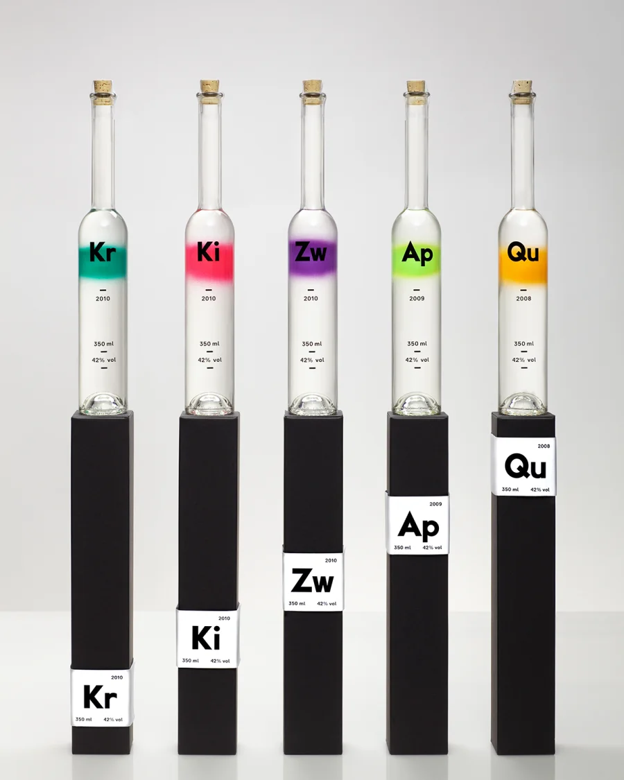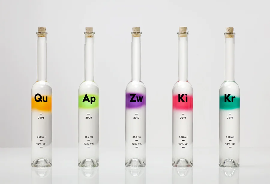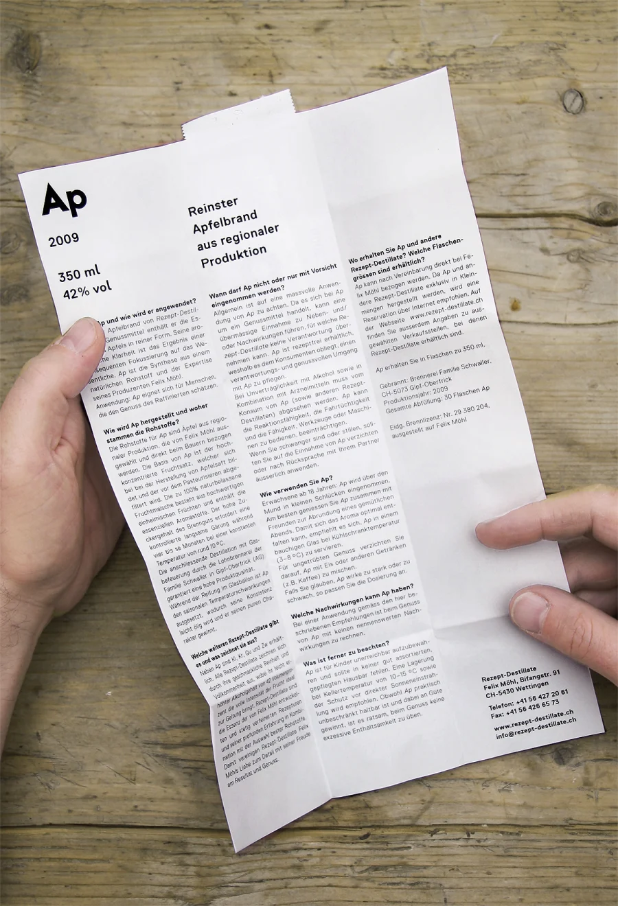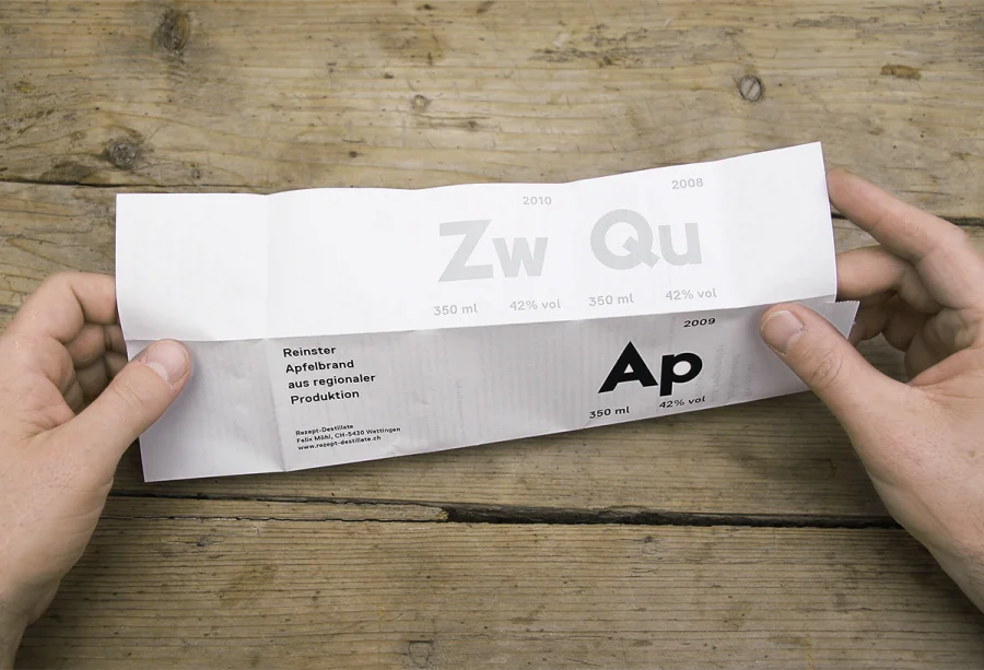 ‘Reduktion auf das Essentielle’ ist das Prinzip der Markengestaltung dieser exklusiven Fruchtbrände. Hergeleitet ist es vom Produktionsprozess der Destillation, bei der die Früchte auf ihre geschmackliche Essenz reduziert werden. Die Metapher reiner Elemente – Ap, Ki, Kr, Qu, ZW – bringt den puren Charakter des Produktes auf den Punkt. So wird die Themenwelt der Pharmazeutik zu Beginn des letzten Jahrhunderts zum Fundus für einen unverwechselbaren Markenauftritt. Auf den thematischen Kontext beziehen sich denn auch weitere Gestaltungselemente wie die Banderole auf Dünndruckpapier (Beipackzettel) oder die Sorten-Systematik gemäss den Grössen der verwendeten Früchte. Mit einfachsten technischen Mitteln wird dem Produkt ein Ausdruck höchster Wertigkeit und Exklusivität verliehen.