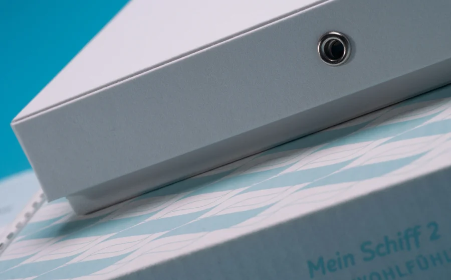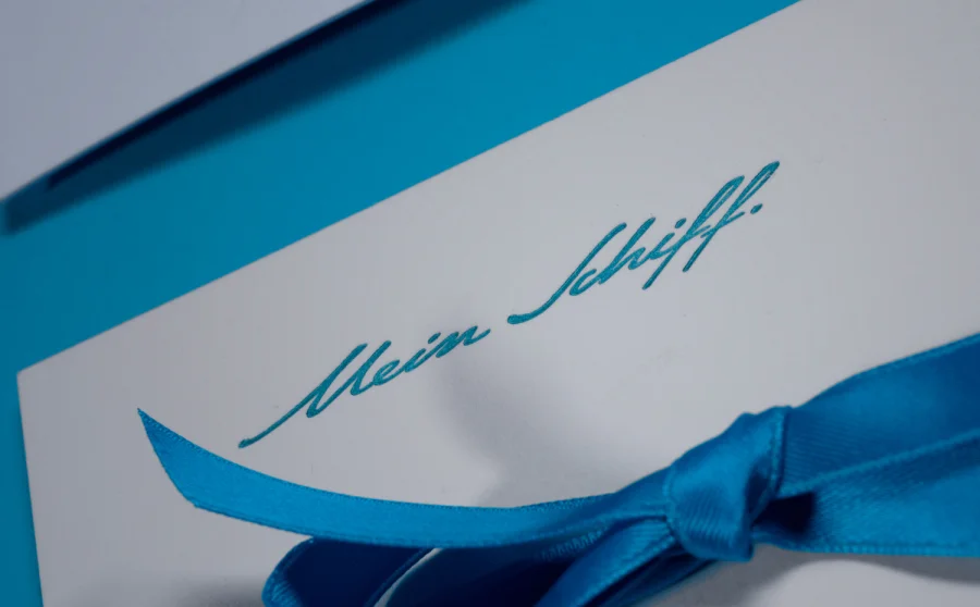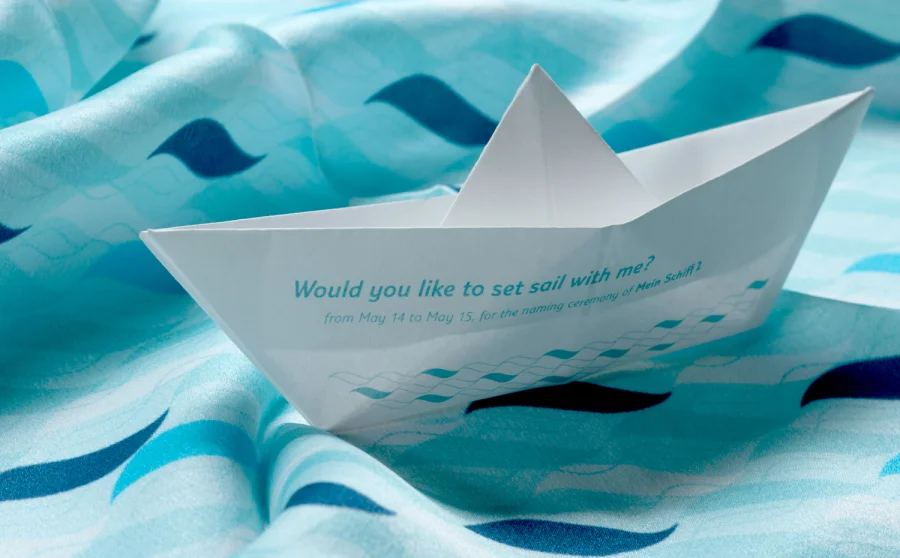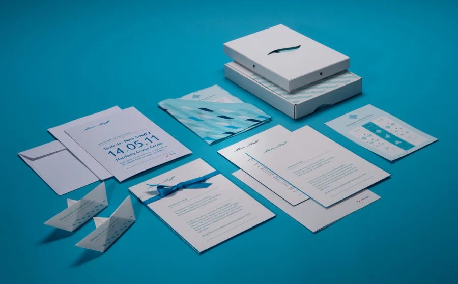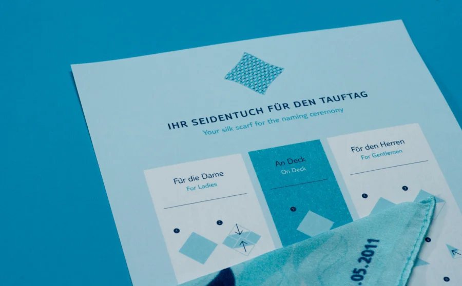 Die Wohlfühltaufe der »Mein Schiff 2« bot uns viel Raum für die Gestaltung einer Eventkommunikation auf höchstem Niveau. Dem TUI Cruises Motto »Tausend Farben Blau« folgend, entstand ein Save the Date auf feinstem »Mohair« von Gmund, gefolgt von einem Einladungspackage mit zahlreichen Feinheiten: Baumwollpapier, handverarbeitet zu einer Box, darin die Einladungskarten im Buchdruck produziert, ein Begleiterelement in Form eines per Hand gefalteten Schiffchens, ein Seidentuch bedruckt mit dem wiederkehrenden Wellenmotiv, verpackt in einer im Siebdruck bedruckten Box aus weißer Wellpappe.