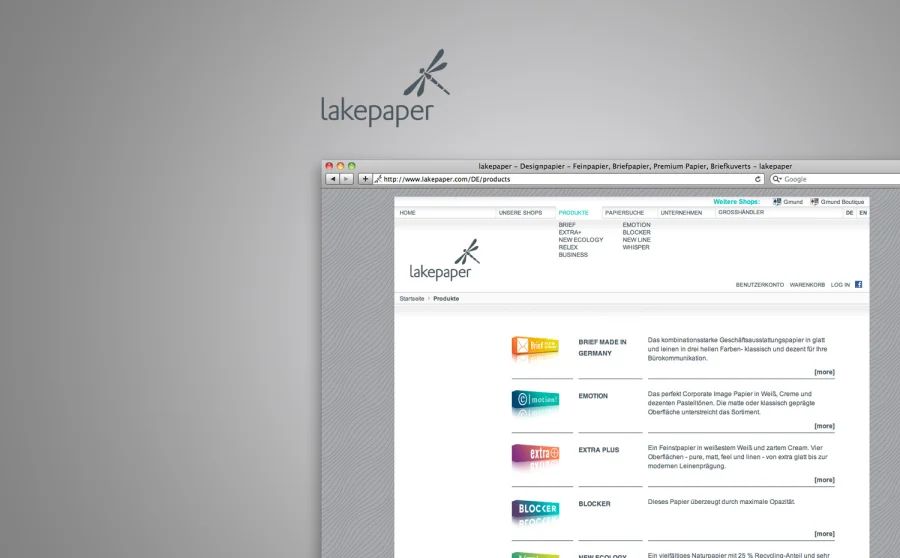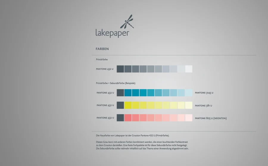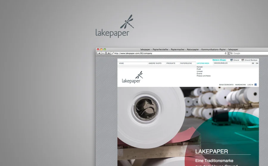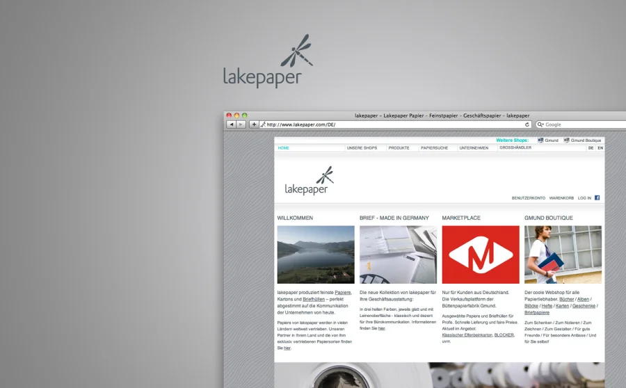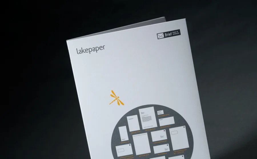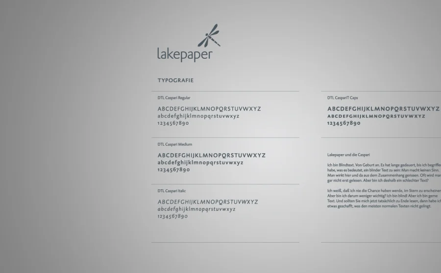 Das Erscheinungsbild für eine Papiermarke zu entwickeln war für uns ein großes Vergnügen! lakepaper, eine Schwestermarke der Büttenpapierfabrik Gmund, sollte ein jüngeres und frischeres Aussehen erhalten. Das Logo besteht jeweils aus 2 Elementen, der Wortmarke und der Libelle, letztere wurde komplett grafisch überabeitet. Sie kann um die Wortmarke frei positioniert werden. Auch die Wortmarke erhielt ein neues Aussehen, wir entschieden uns als Basis für die Schrift Prokyon, diese wurde leicht modifiziert. Als ergänzendes Element gibt es immer einen Kreis, der als grafische Übersetzung für den Standort der Papierfabrik, den Tegernsee, steht. Dieser wird je nach Art und Anlass thematisch neu interpretiert.