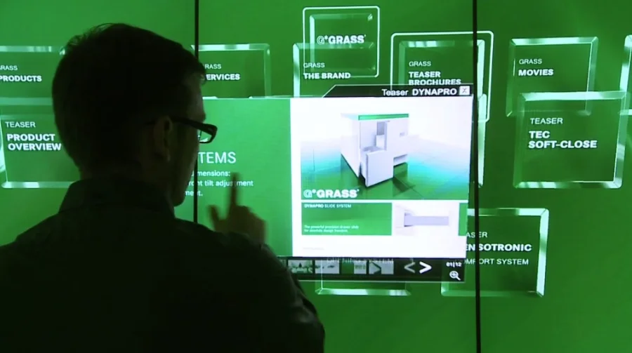 23 LCD displays attached inside the “Multitouch Experience Cube” formed a estimated 14 meter long multitouch wall. Inside visitors experienced a interactive product show controlled via iPhone app and moderated by a host.