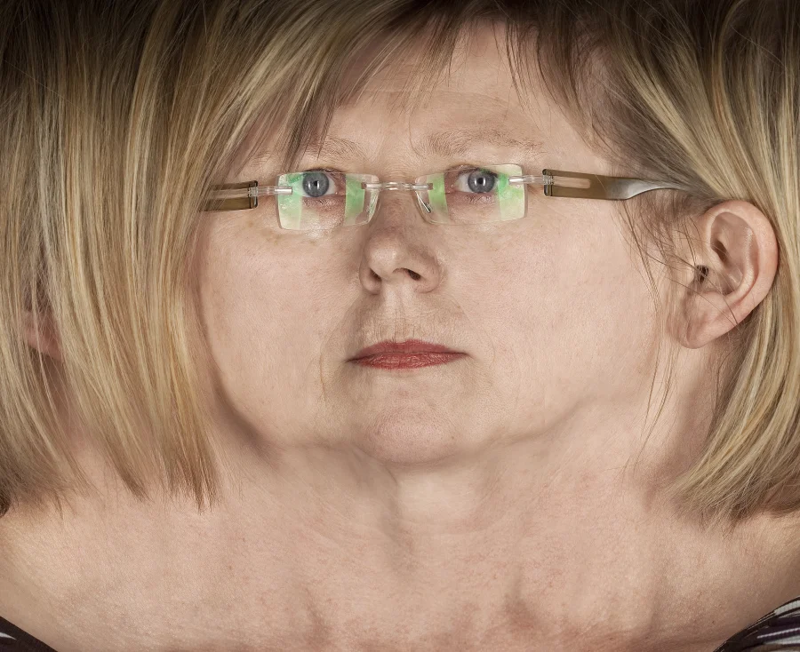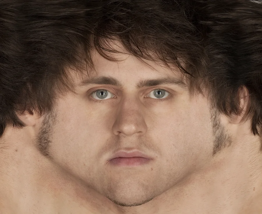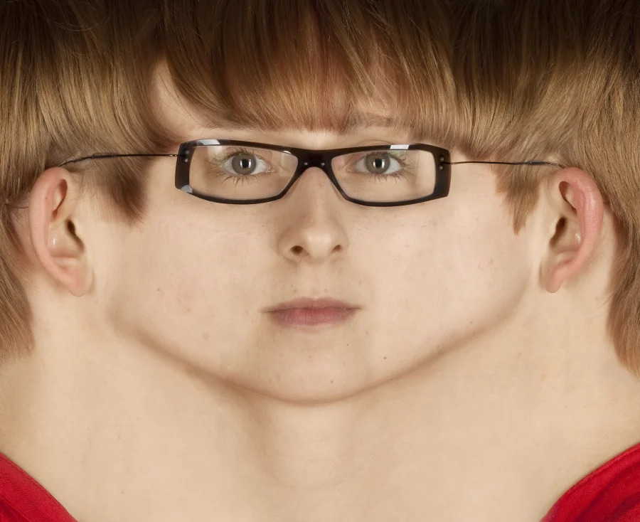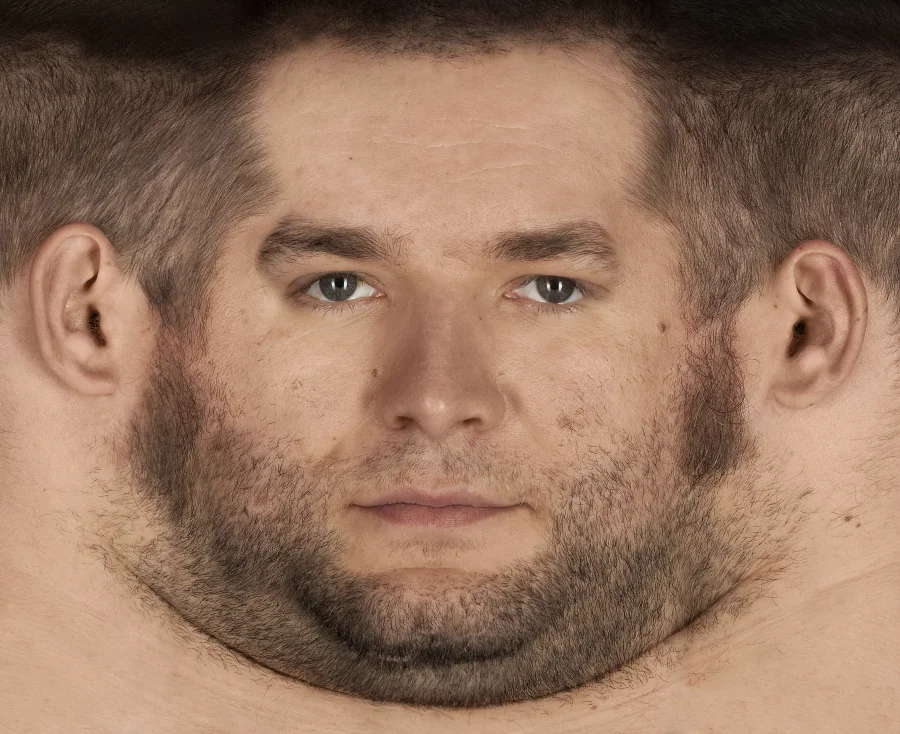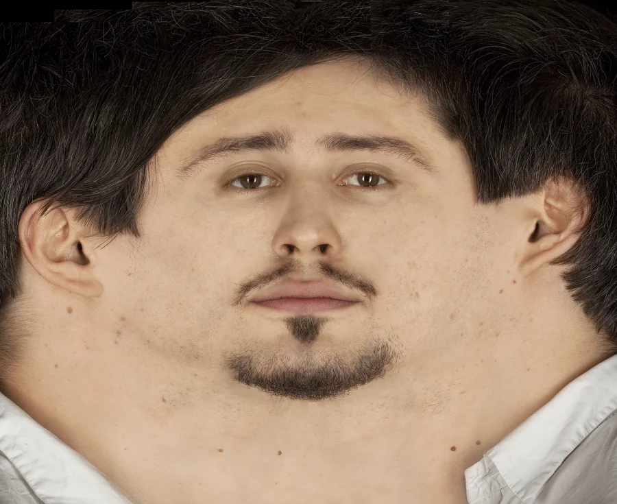 Die “umgedrehten” Panoramen sind Zusammenfügungen aus – je Gesicht – 12 Einzelfotografien, welche unter Studiobedingungen entstanden sind.