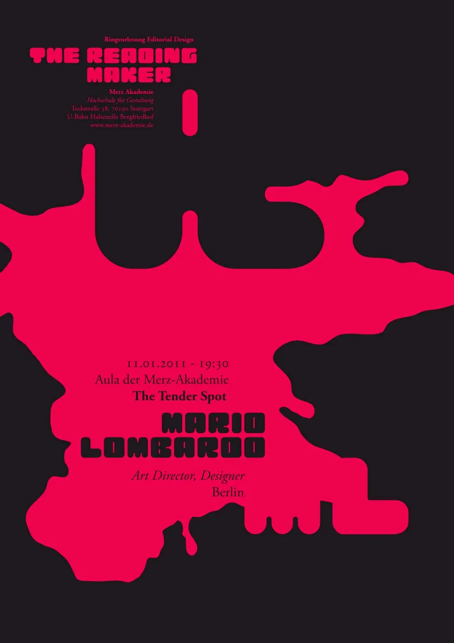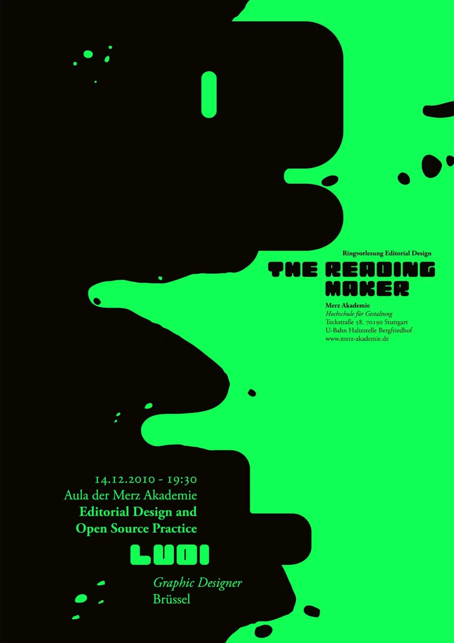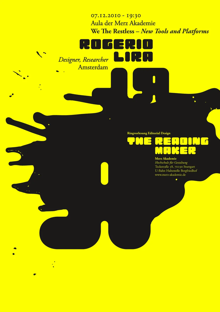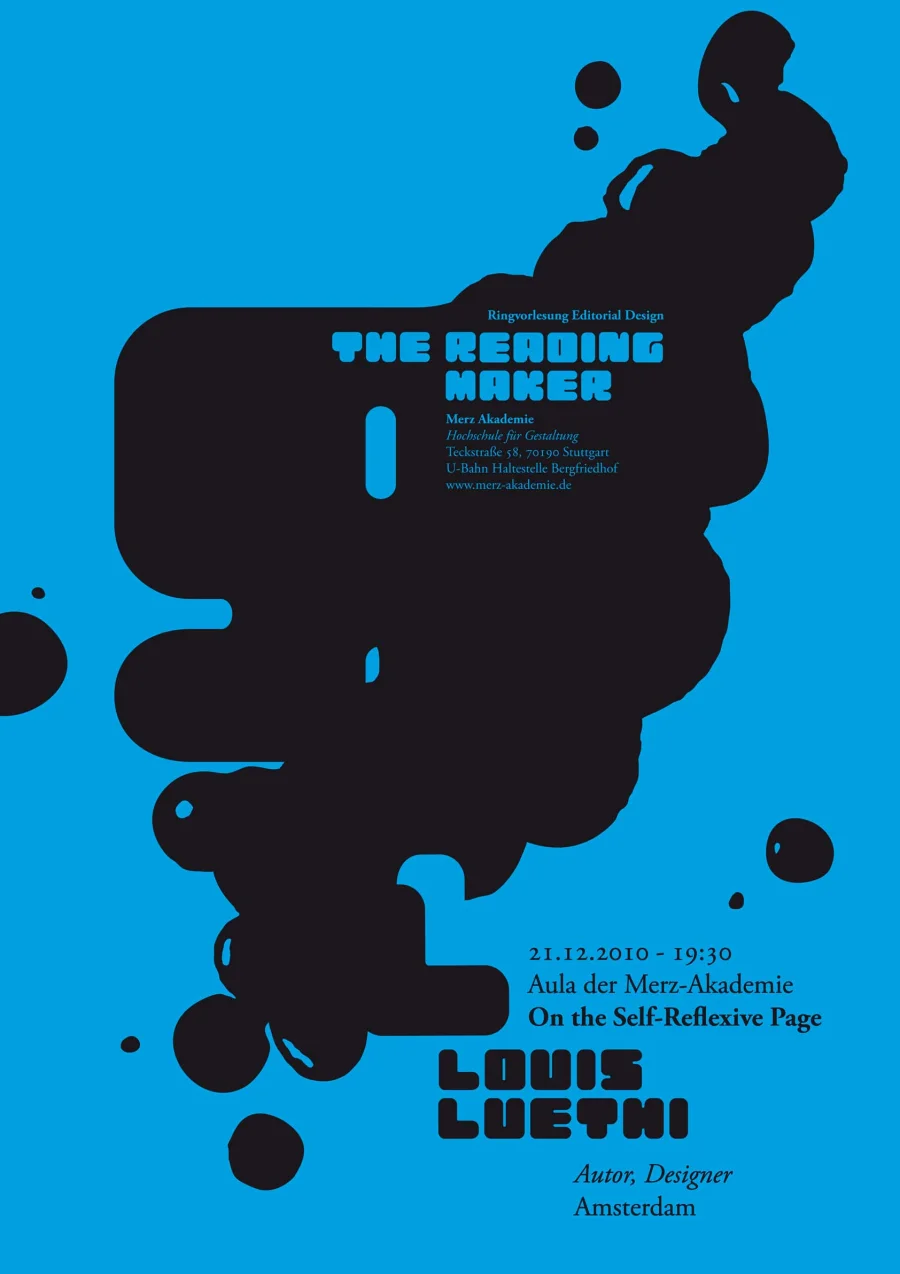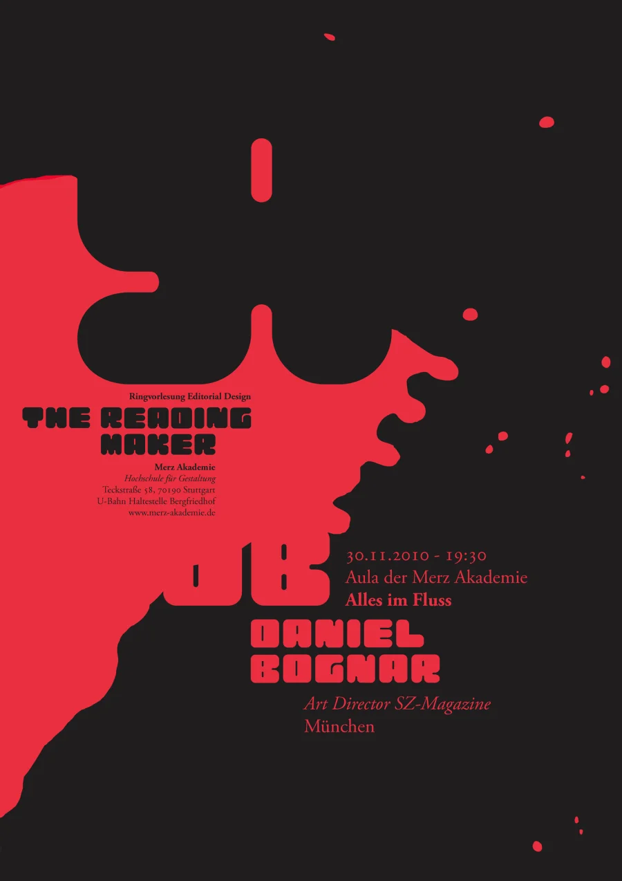 Jedes Jahr lädt die Merz Akademie Stuttgart Gastredner zur öffentlichen Ringvorlesung ein. Dieses Jahr u.a. mit Daniel Bogner, Rogerio Lira und Mario Lombardo. Die Plakatserie entstand in Zusammenarbeit mit Prof. Joost Bottema und spiegelt das Thema »Editorial Design« der diesjährigen Ringvorlesung wieder. DIN A1; Siebdruck
