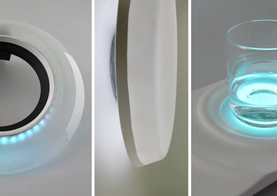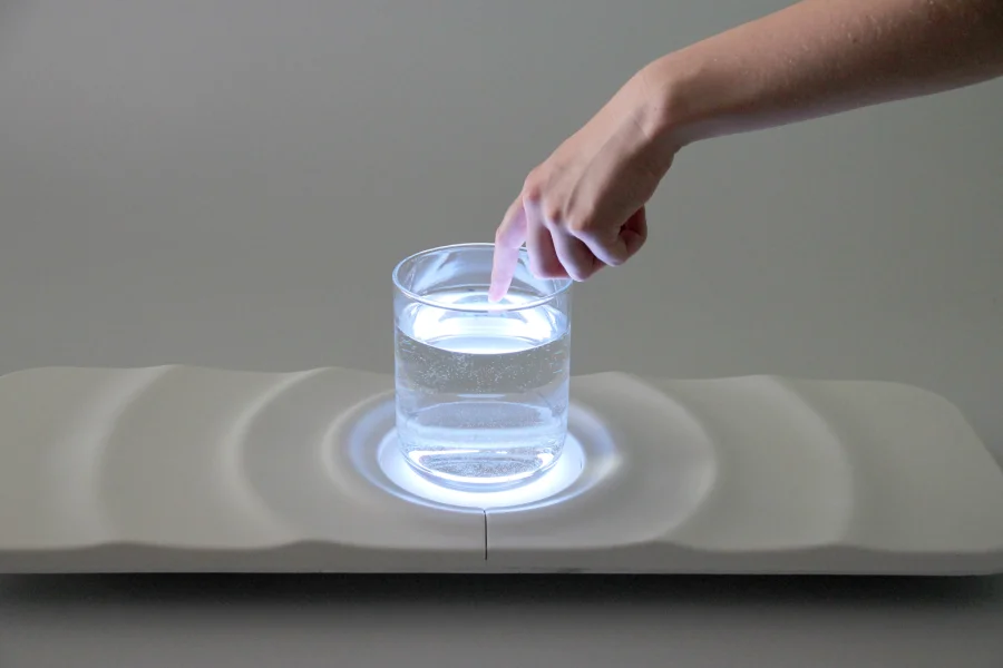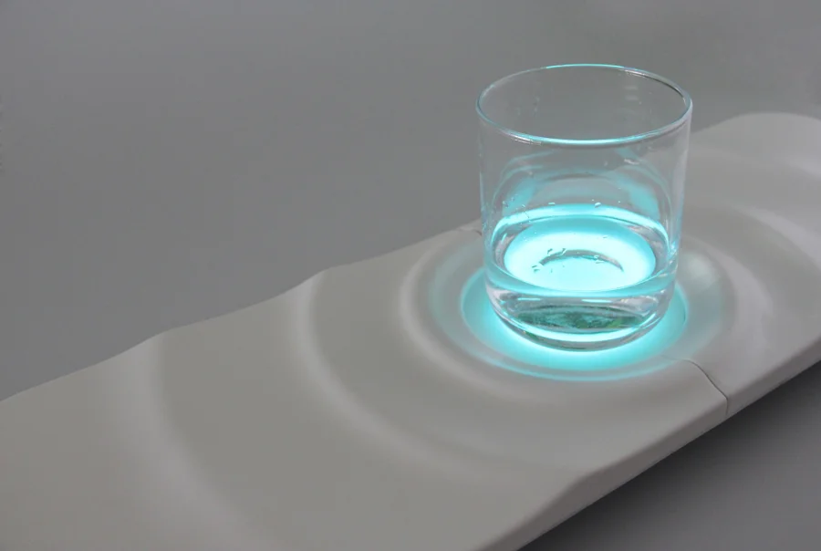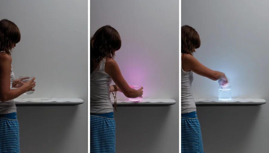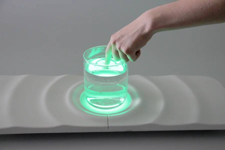 Licht Tropfen. Hier bilden die Elemente Licht und Wasser eine perfekte Symbiose. Durch die Wassermenge in einem Gefäß wird die Lichtmenge reguliert. Und dass rühren mit dem Finger im Wasser wechselt wie durch Zauberhand die Lichtfarbe.