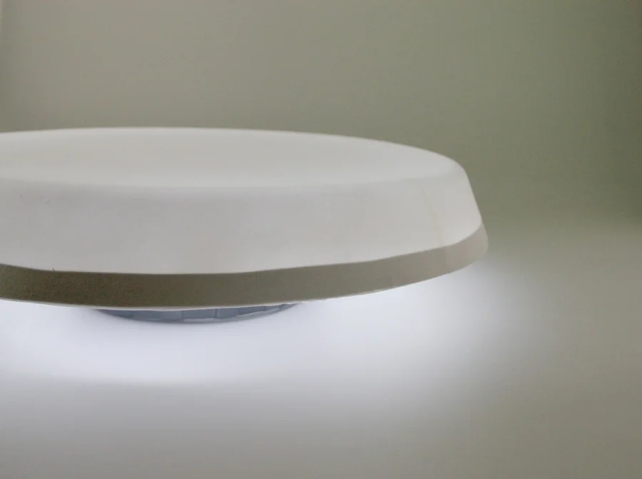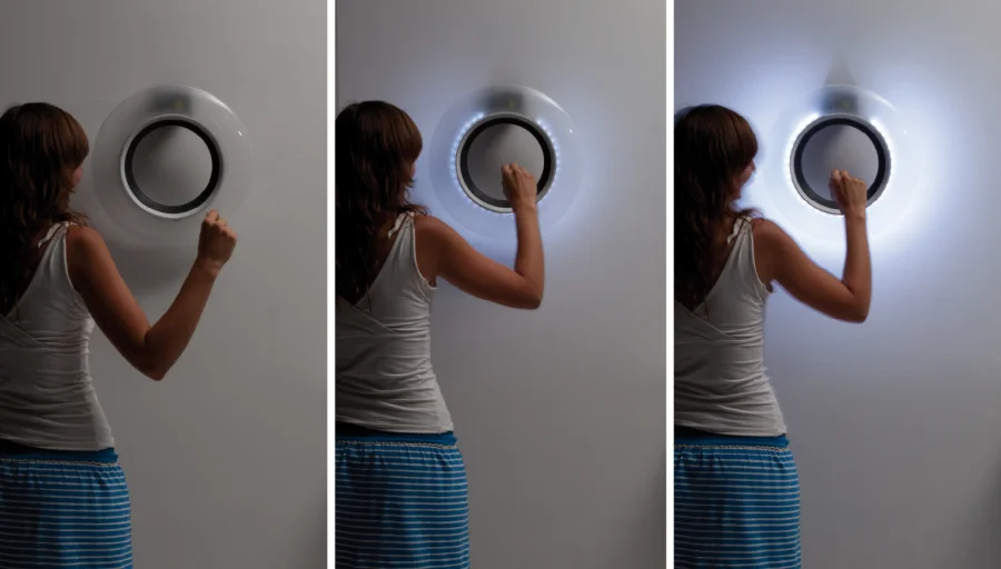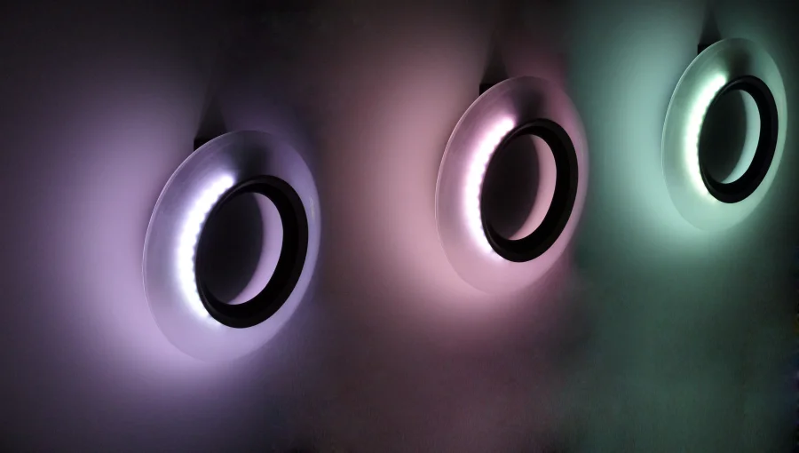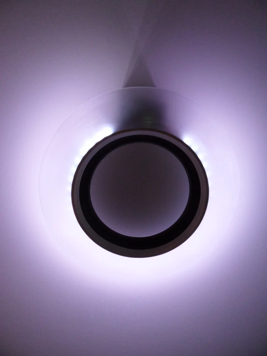 Air Light. Die Leuchte wird berührungslos über das eingreifen in den ring aktiviert. Eine Drehung der Hand im inneren ermöglichst das justieren der Lichtfarbe.