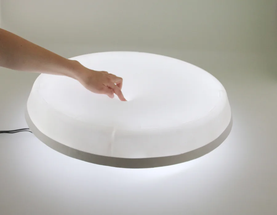 Seide. Diese Leuchte nutzt einen flexiblen Stoff als Interface. Durch Berühren und Drücken der Oberfläche kann auf simpelste Art und Weise Licht gedimmt werden.