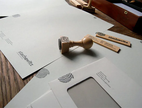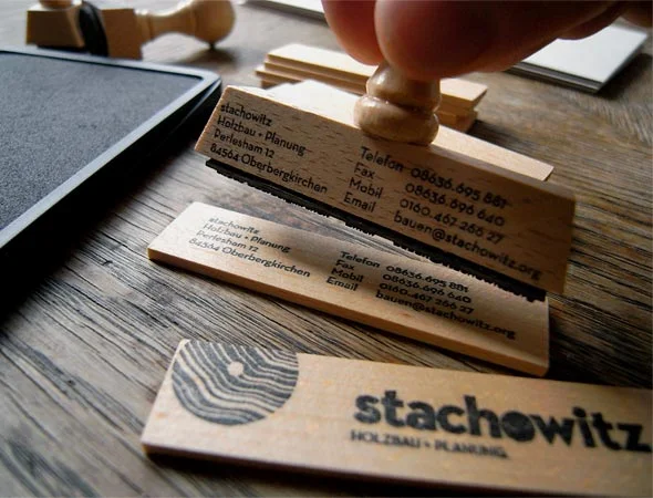 Ein modulares Stempelsystem ermöglicht die manuelle Reproduktion der Geschäftsmaterialien. Damit wird dem Handwerker ein echtes «Werkzeug» und sein Werkstoff Holz in die Hand gegeben.
