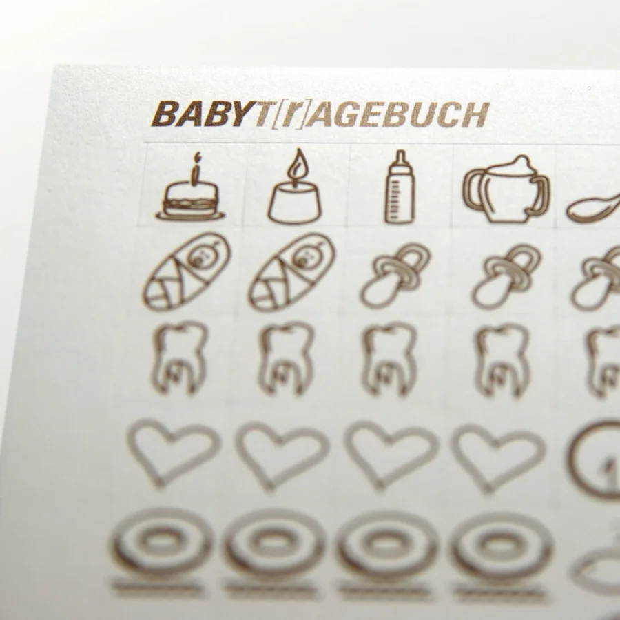 Das cremefarbene, hochwertige Naturpapier Munken Print Cream 1.5 wurde für ein natürlich haptisches und optisch ansprechendes Design gewählt. Da das Babyt(r)agebuch individuell durch Einträge und Icon-Sticker personalisiert werden kann, eignet sich das Buch ideal als Geschenk für frischgebackene Eltern.