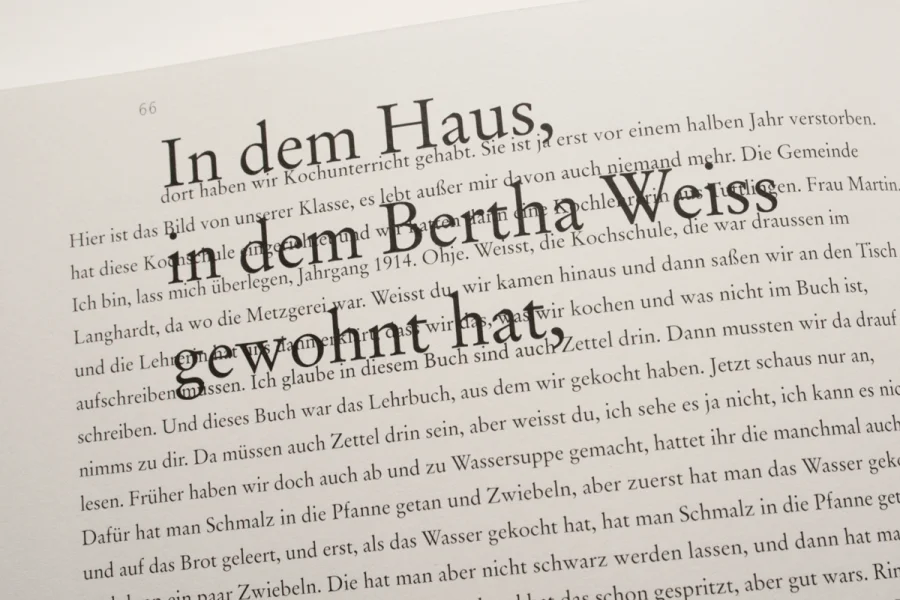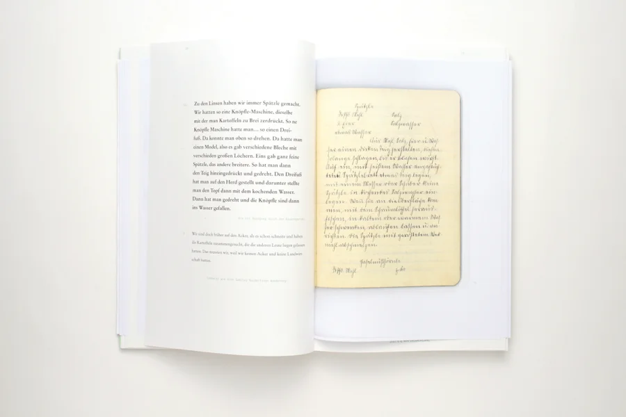 Die gesamte Gestaltung, das Format und Raster sowie die Typografie basieren auf dem Notizbuch meiner Großmutter. Hauptstilmittel bildet die Kopie – die direkteste Form der Reproduktion. Gleichermaßen Abbild und Original, da nicht 1:1 wiederholbar. Hierbei wurden die kopierten Seiten nicht digitalisiert, sondern als Kopie in das Buch eingebunden. Die Kopie als Konzept (kein Abbild ohne Original, keine Enkelin ohne Großmutter) wird in allen Teilen des Buches aufgegriffen, sei es durch die Notizbuchseiten, die Nahrungsmittel, die Fotografien oder den Titel des Buches selbst. Dadurch wird die Ursprünglichkeit hervorgehoben.