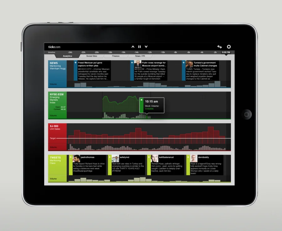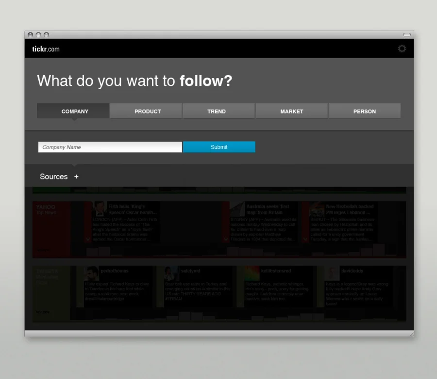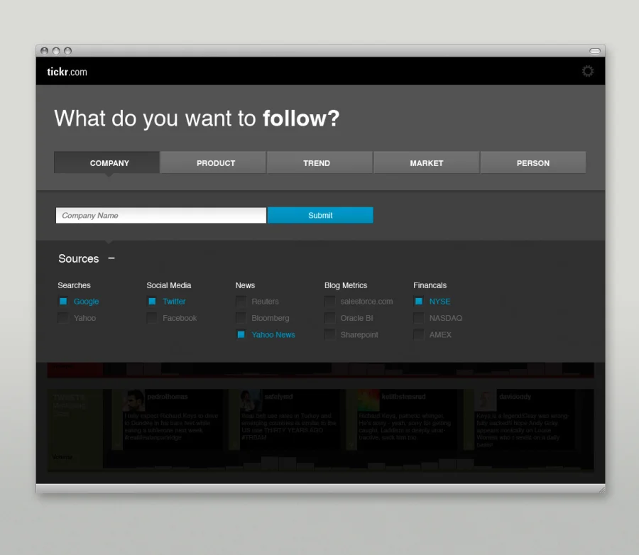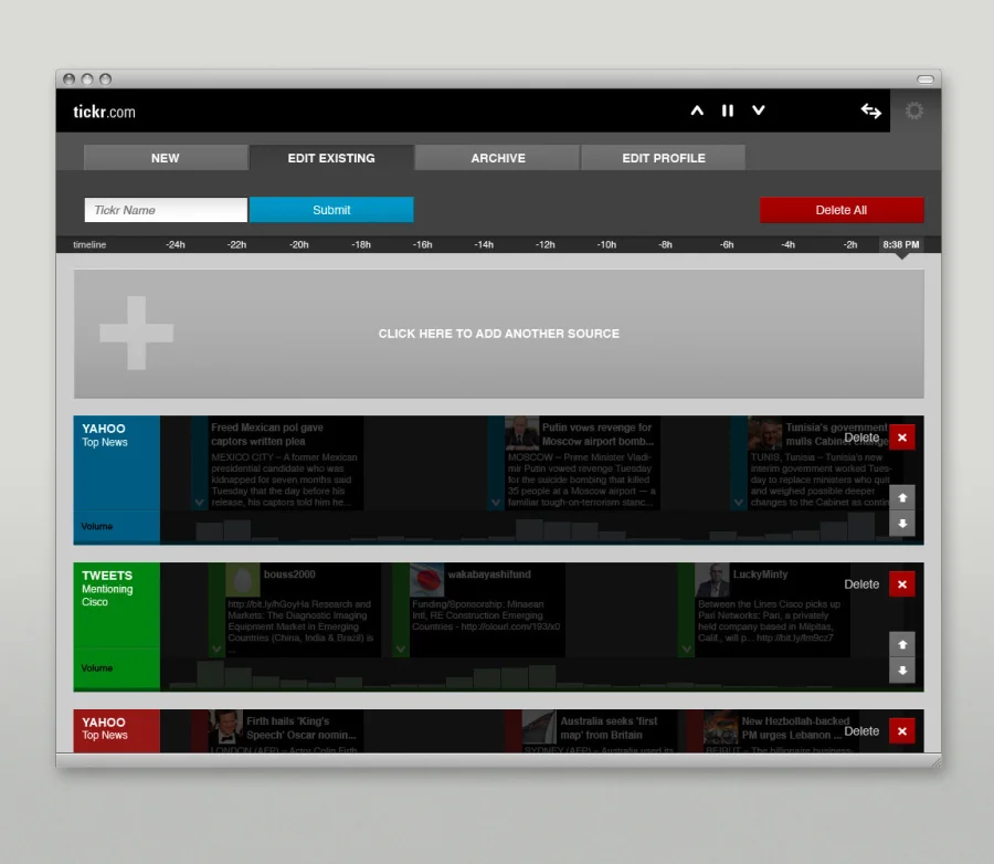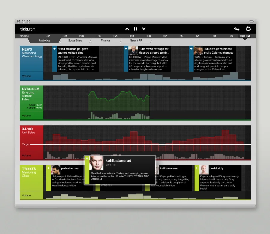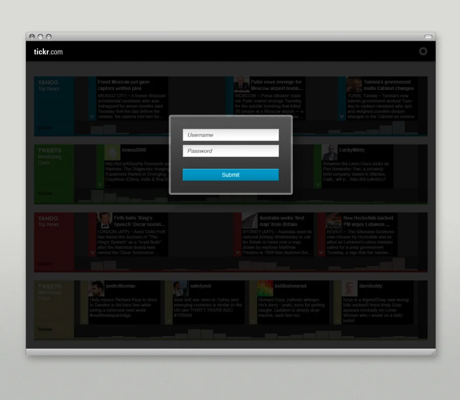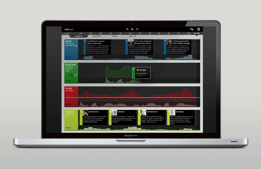 In enger Zusammenarbeit mit Infomotor war ich verantwortlich für das User Interface Design der Geschäftssoftware Tickr. Tickr macht es einfach alle Arten von Geschäftsinformationen zu verfolgen – in Echtzeit. Tickr ist eine cloud basierte Plattform mit der sich individualisierbare Geschäftsinformationen einfach und bequem anzeigen, bearbeiten und integrieren lassen. Die Software und das Design befinden sich noch in einer Betaphase die ständig weiterentwickelt und um zusätzlich Feature erweitert werden.