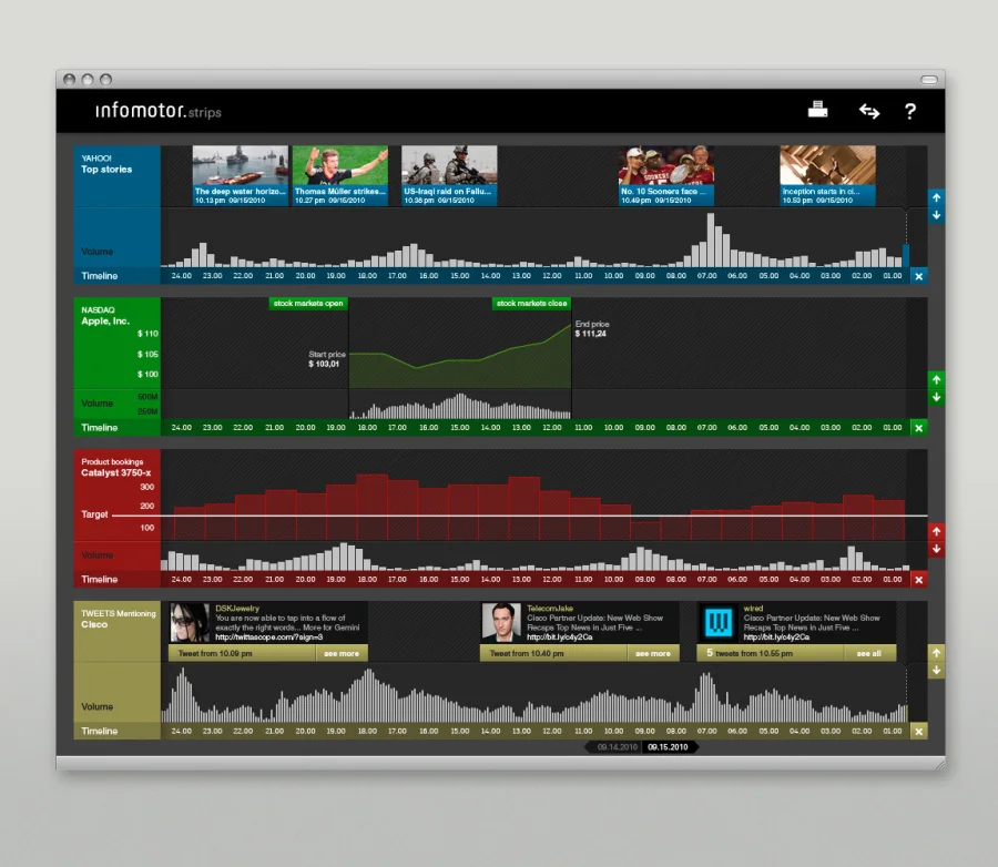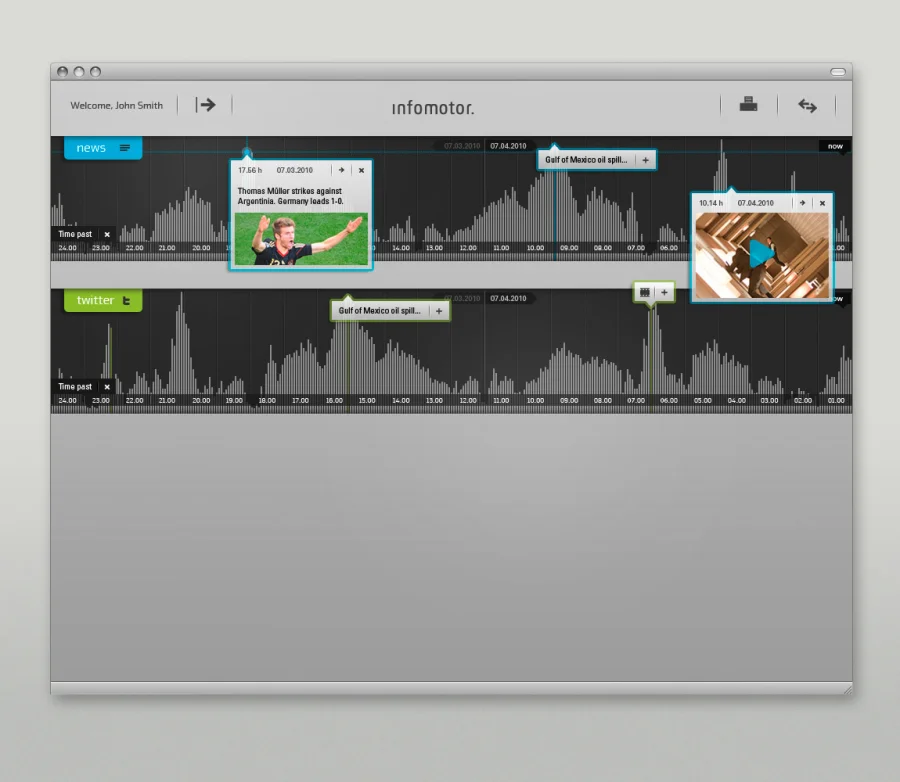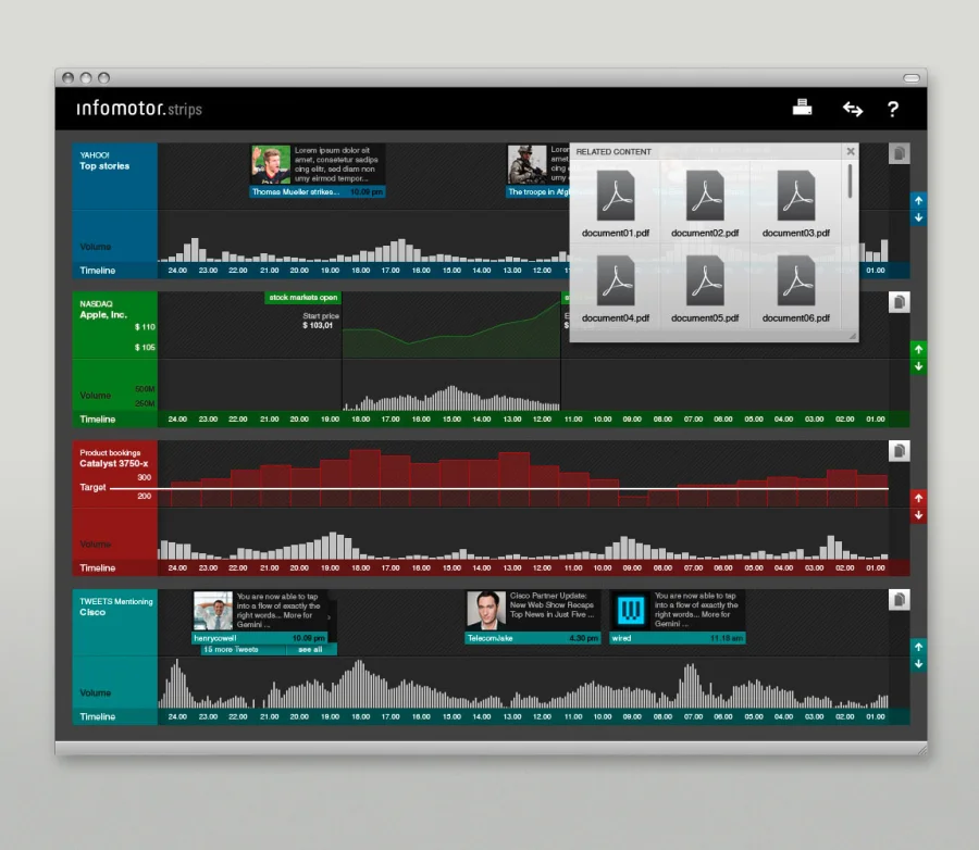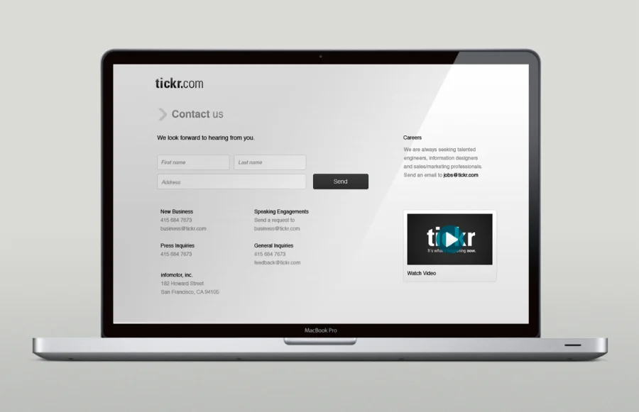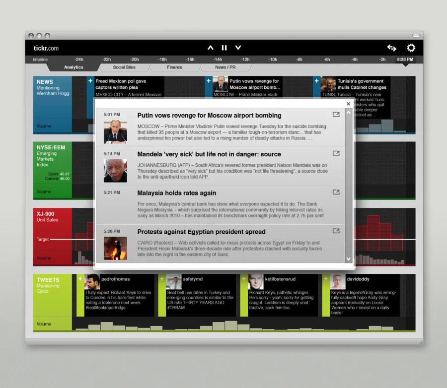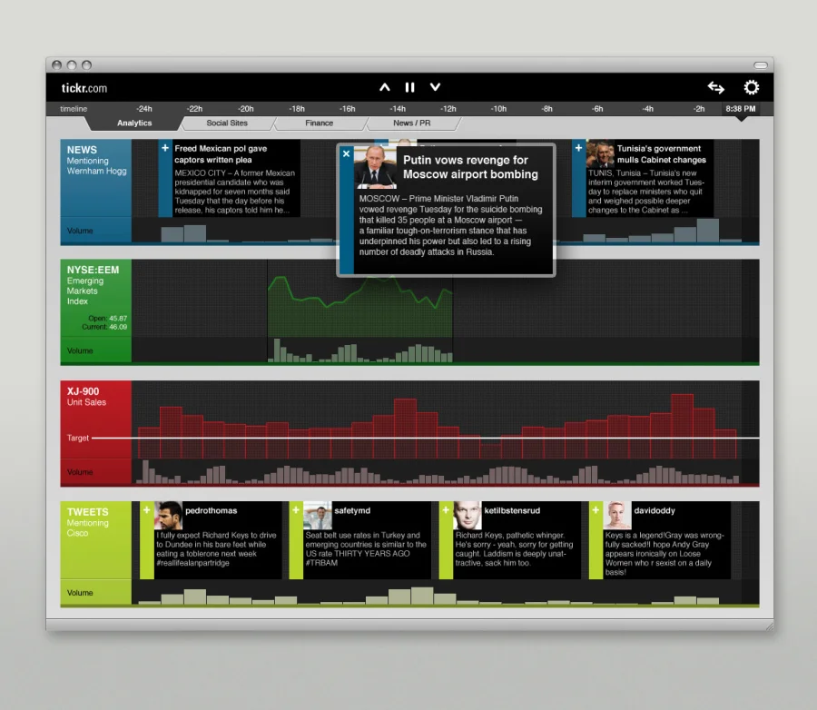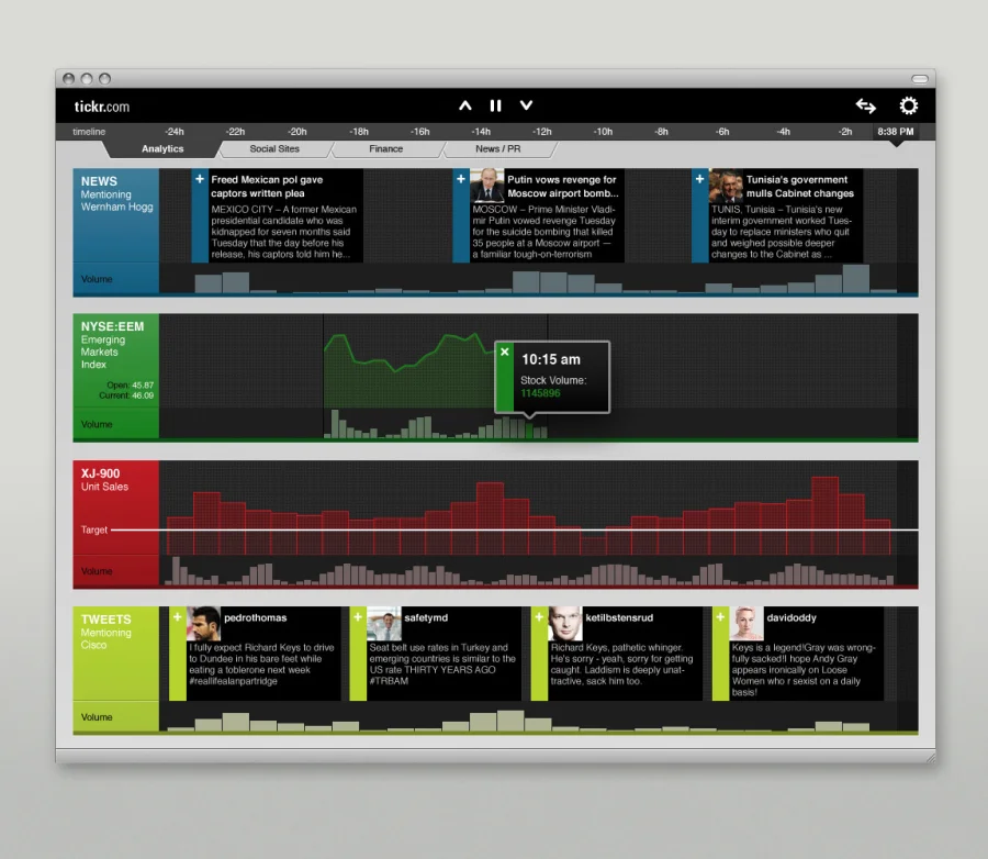 In enger Zusammenarbeit mit Infomotor war ich verantwortlich für das User Interface Design der Geschäftssoftware Tickr. Tickr macht es einfach alle Arten von Geschäftsinformationen zu verfolgen – in Echtzeit. Tickr ist eine cloud basierte Plattform mit der sich individualisierbare Geschäftsinformationen einfach und bequem anzeigen, bearbeiten und integrieren lassen. Die Software und das Design befinden sich noch in einer Betaphase die ständig weiterentwickelt und um zusätzlich Feature erweitert werden.