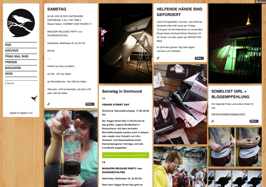 Neben den Artikeln zum Ruhrgebiet, wie zum Beispiel über die DortmunderFotografin Eva Horstick-Schmitt, über die Oma aus der Garage oder vierschönen Plätzen, an denen man sich den Magen voll schlagen kann, stellen wir euch auch ein Buch, einen Film und im Rahmen unseres Musik-Blogs Audiokommune auch zwei Platten vor. Des weiteren gibt esdie Premiere eines neuen Wegbegleiters: ab sofort wird euch Der Quantum Affe seine Sicht auf die Welt darlegen.