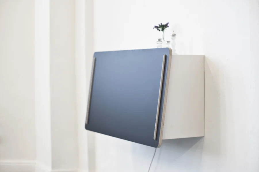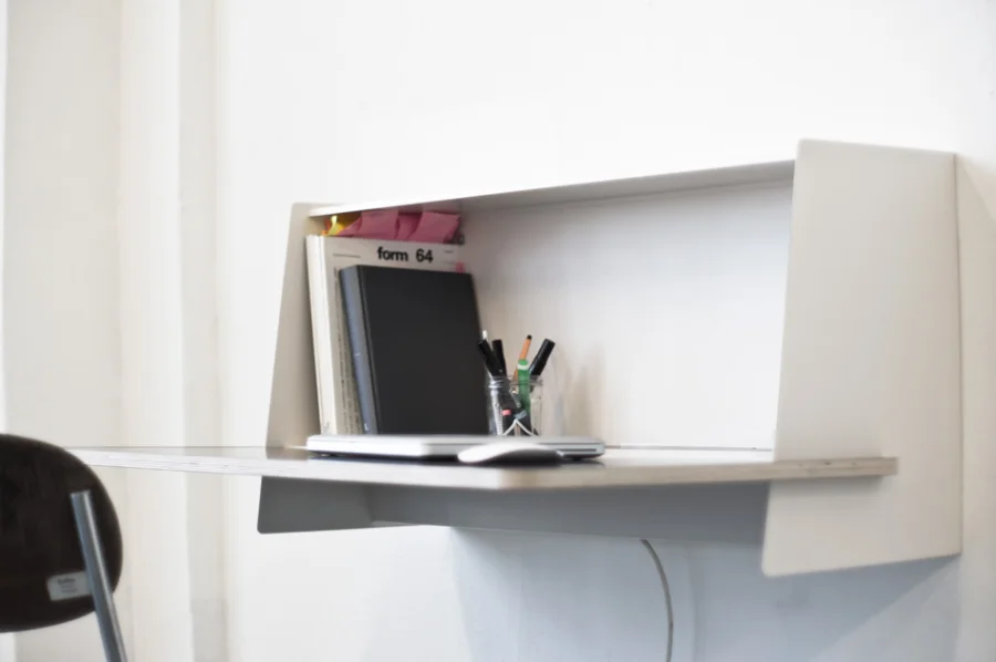 S01 ist ein kompakter und in der Form reduzierter Wandsekretär, der auch in kleinen Räumen eine optimale Arbeitsfläche bietet. Seine individuelle Scharnierlösung ermöglicht ein simples Auf- und Zuklappen der Arbeitsplatte, wodurch ein Laptop sowie Arbeitsmaterialien spontan nutzbar werden und eben so schnell aus dem Sichtfeld verschwinden. Mehrfachsteckdose, Festplatte und die entsprechenden Kabel finden im integrierten und auf den ersten Blick kaum wahrnehmbaren Stauraum ihren Platz. Die an der Unterseite positionierte Öffnung ermöglicht die Stromversorgung. S01 ist im aufgeklappten sowie im geschlossenen Zustand ein dezentes, platzsparendes und zugleich prägnantes Wohnmöbel.