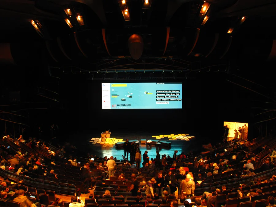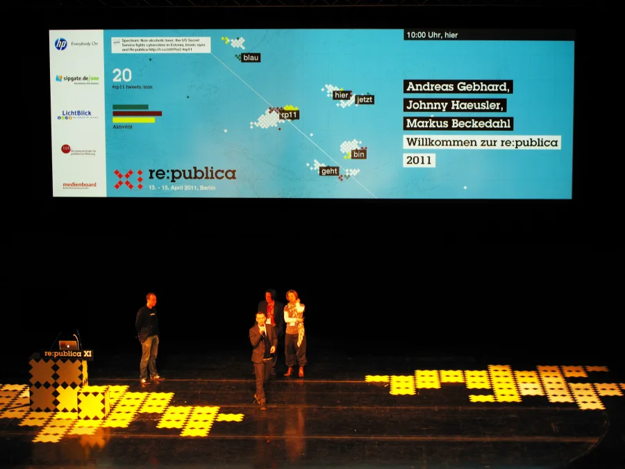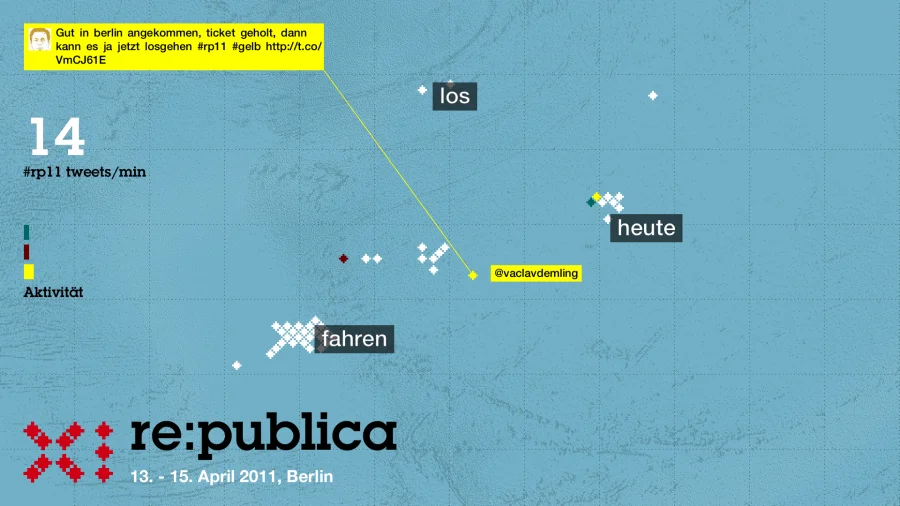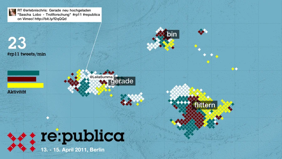 Gefüttert von Twitter-Nachrichten der Konferenzteilnehmer entsteht eine Karte in Echtzeit. Tweets mit populären Worten bilden Landmassen – und zerfallen wieder.