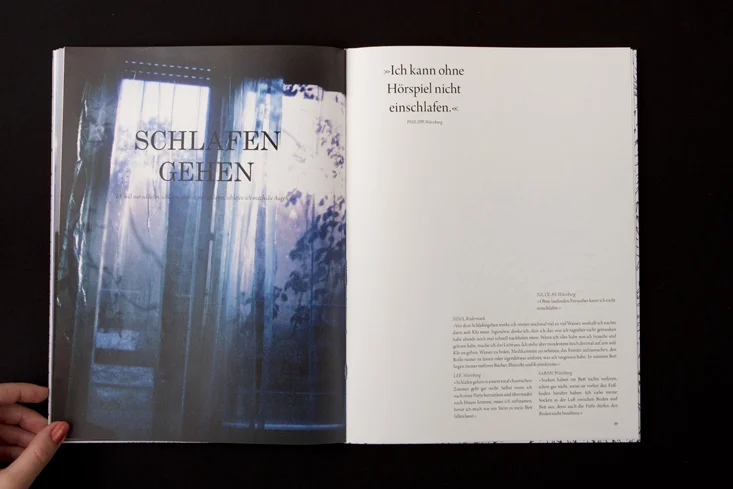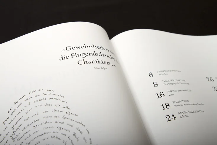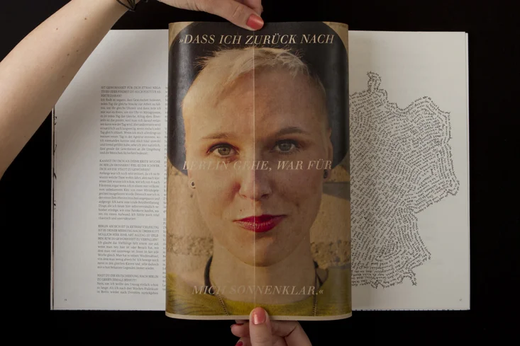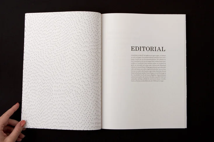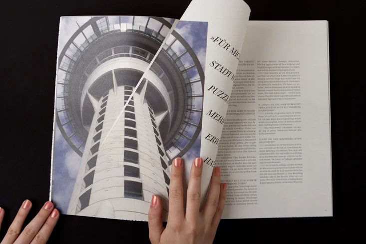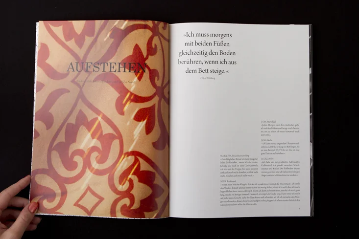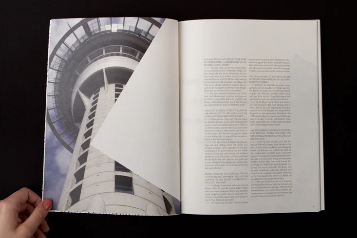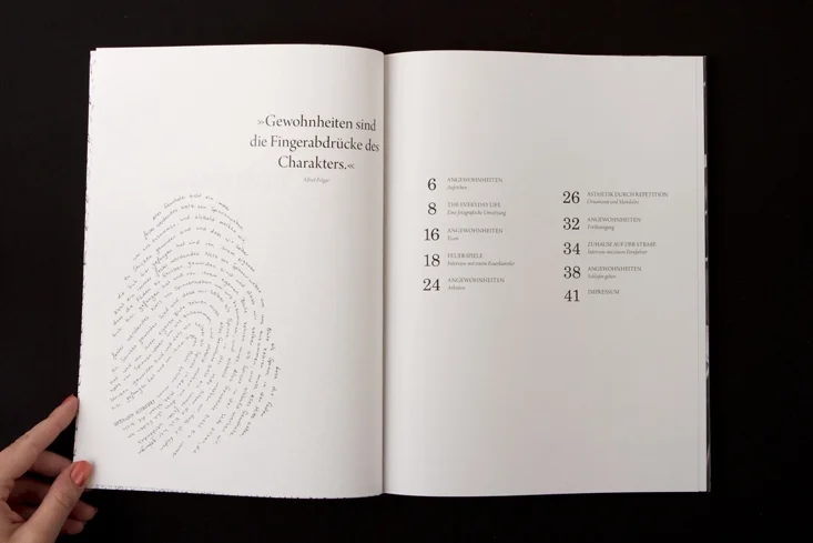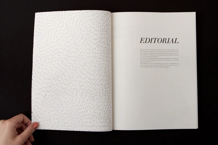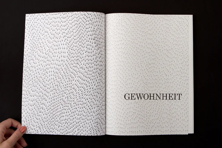 Die Arbeit besteht aus zwei Magazinen, die durch eine doppelseitige Klebebindung zusammengefügt sind. Denn genau wie die Themen Gewohnheit und Neues entdecken unmittelbar miteinander verbunden sind, sind auch die beiden Magazine als solches Wechselspiel zu verstehen.