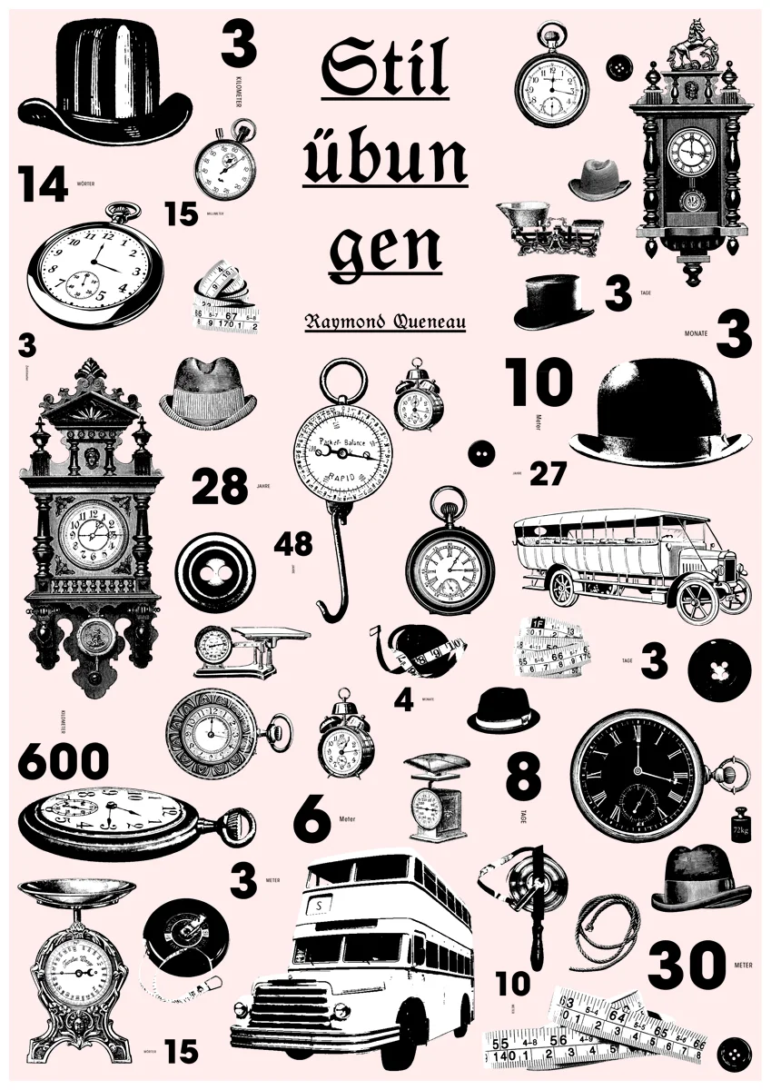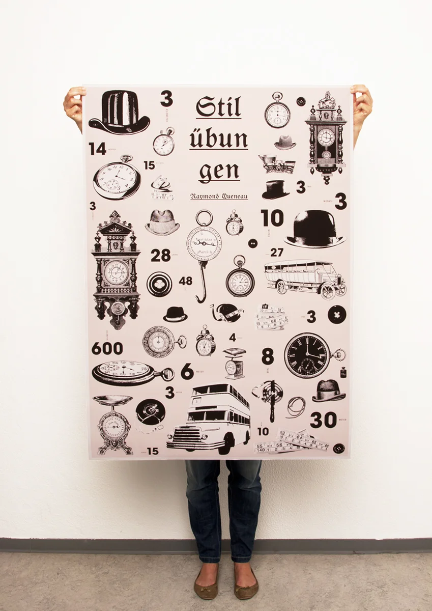 Das Plakat entstand im Rahmen des Seminars »PlusUltra – Steigerungsmotive in der Plakatgestaltung«. Aufgabe war es, eine von Raymond Queneaus 108 Stilübungen in ein Plakat zu übertragen. Das Thema sollte hierbei mittels eines Steigerungsmotivs (visuell) komplex formuliert werden. Die Umsetzung der Stilübung »Genauigkeiten« hat als zentrale Gestaltungsmotive Zeit, Strecke und Gewicht.