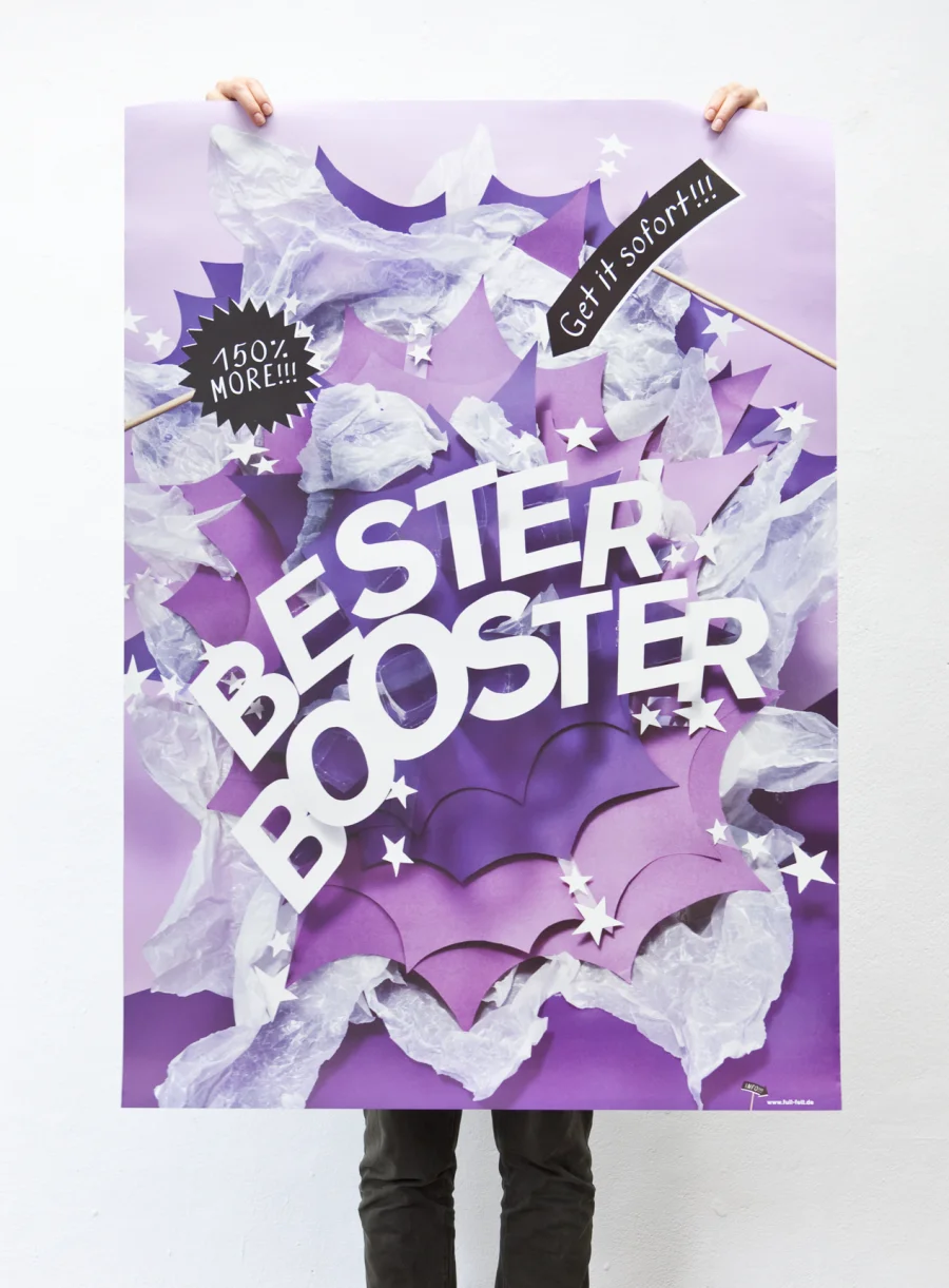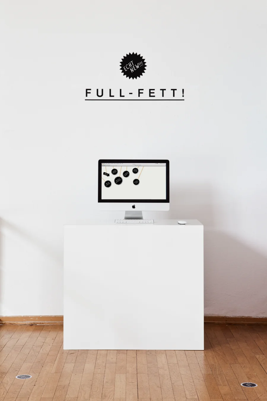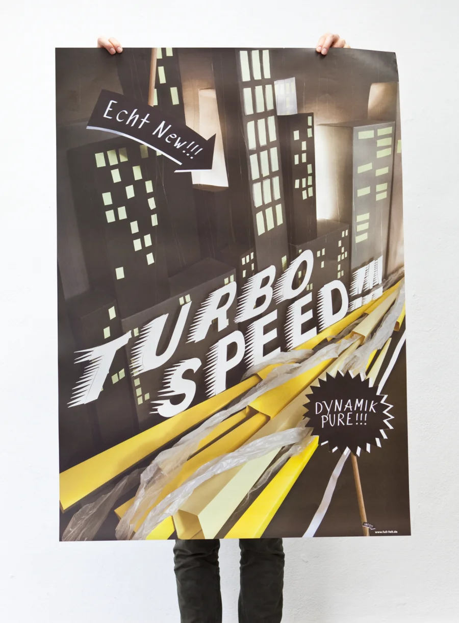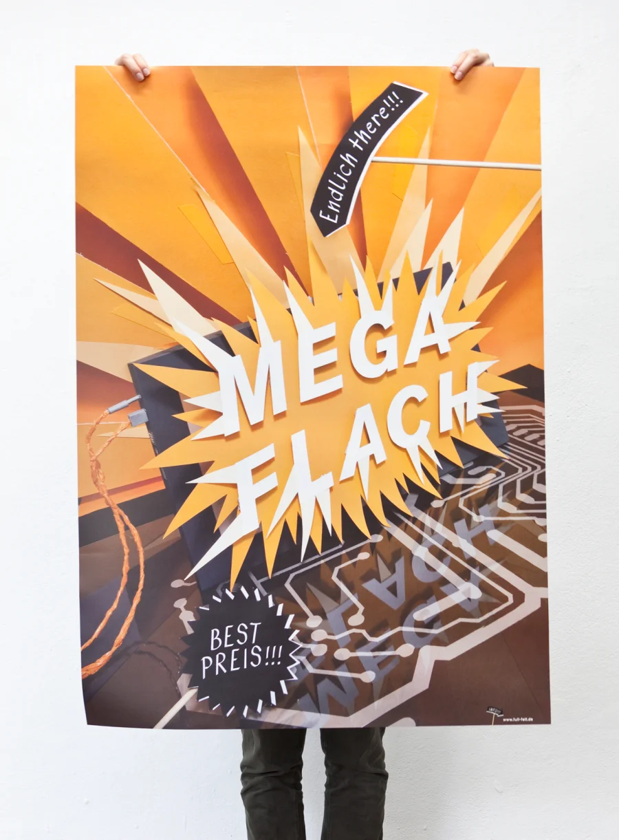 Glanz und Glamour, Superlative, große Wort- und Vorteilsmengen – perfekt eingestellt steuert Werbung das Kaufverhalten der Konsumgesellschaft. Und wir sind mitten drin: ›Super Fresh‹ mit ›Turbo Speed‹ zum ›Ultra Bio‹ und ›Mega Flach‹ – herzlichen Glückwunsch ! Sie sind der millionste Besucher ! Peng ! Da ist der Hauptgewinn! Nutzen sie auch schon den ›Bester Booster‹ ? So oder so ähnlich erleben wir unsere Welt. Ganz nach dem Motto ›Advertise mich !‹ und wenn’s nicht der Werbespot zuhause schafft, dann spätestens das Plakat an der Hausfassade gegenüber. Die Plakatreihe ›Full-Fett !‹ gibt bekannten Worthülsen ein neues Bild. Sie dekontextualisiert die denglischen Begriffe der Werbersprache und verbindet grafische Effekte mit einer naiven Umsetzung aus Papier. Die Plakatserie gibt Gestaltern einen Impuls zum Nachdenken und zur eigenen Neuausrichtung ihres Verhältnisses zur Werbung. Der Gestalter kann Einfluss darauf haben, ob eine Werbekampagne inhaltlich anspruchsvoll oder eine weitere Wiederholung der immer gleichen Parameter wird. Wiederholungen sind einfach und prägen sich automatisch ein – die Neukonzeption einer Kampagne ist immer mit einem Risiko verbunden – jeder Gestalter muss sich entscheiden welchen Weg er einschlagen will.