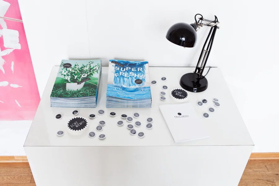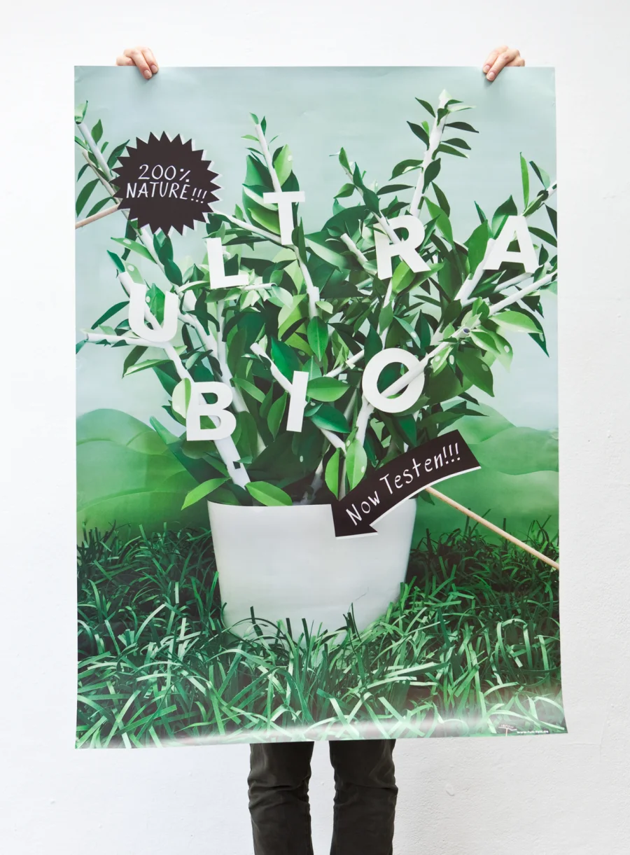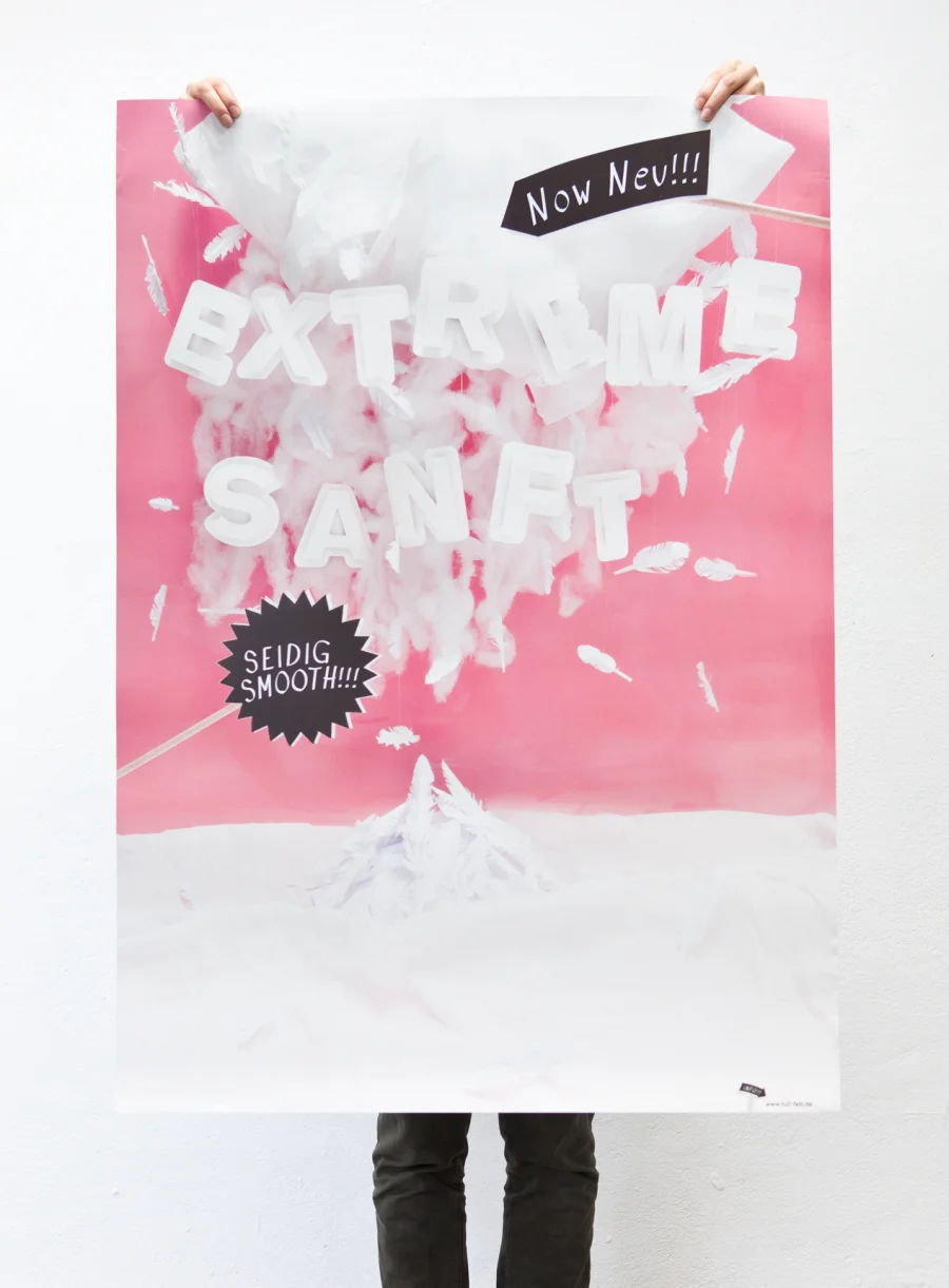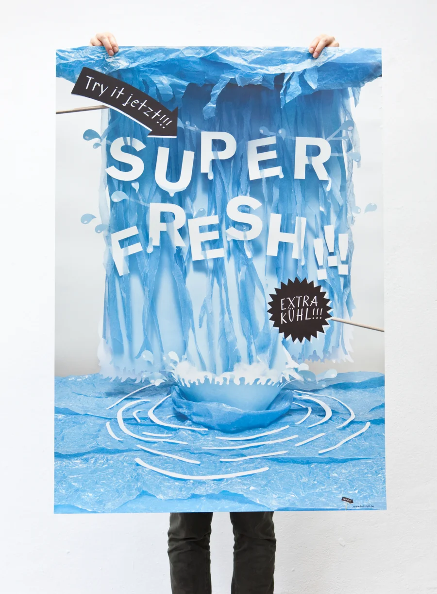 Glanz und Glamour, Superlative, große Wort- und Vorteilsmengen – perfekt eingestellt steuert Werbung das Kaufverhalten der Konsumgesellschaft. Und wir sind mitten drin: ›Super Fresh‹ mit ›Turbo Speed‹ zum ›Ultra Bio‹ und ›Mega Flach‹ – herzlichen Glückwunsch ! Sie sind der millionste Besucher ! Peng ! Da ist der Hauptgewinn! Nutzen sie auch schon den ›Bester Booster‹ ? So oder so ähnlich erleben wir unsere Welt. Ganz nach dem Motto ›Advertise mich !‹ und wenn’s nicht der Werbespot zuhause schafft, dann spätestens das Plakat an der Hausfassade gegenüber. Die Plakatreihe ›Full-Fett !‹ gibt bekannten Worthülsen ein neues Bild. Sie dekontextualisiert die denglischen Begriffe der Werbersprache und verbindet grafische Effekte mit einer naiven Umsetzung aus Papier. Die Plakatserie gibt Gestaltern einen Impuls zum Nachdenken und zur eigenen Neuausrichtung ihres Verhältnisses zur Werbung. Der Gestalter kann Einfluss darauf haben, ob eine Werbekampagne inhaltlich anspruchsvoll oder eine weitere Wiederholung der immer gleichen Parameter wird. Wiederholungen sind einfach und prägen sich automatisch ein – die Neukonzeption einer Kampagne ist immer mit einem Risiko verbunden – jeder Gestalter muss sich entscheiden welchen Weg er einschlagen will.