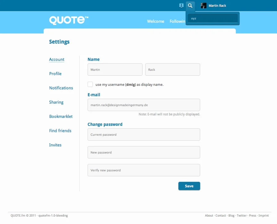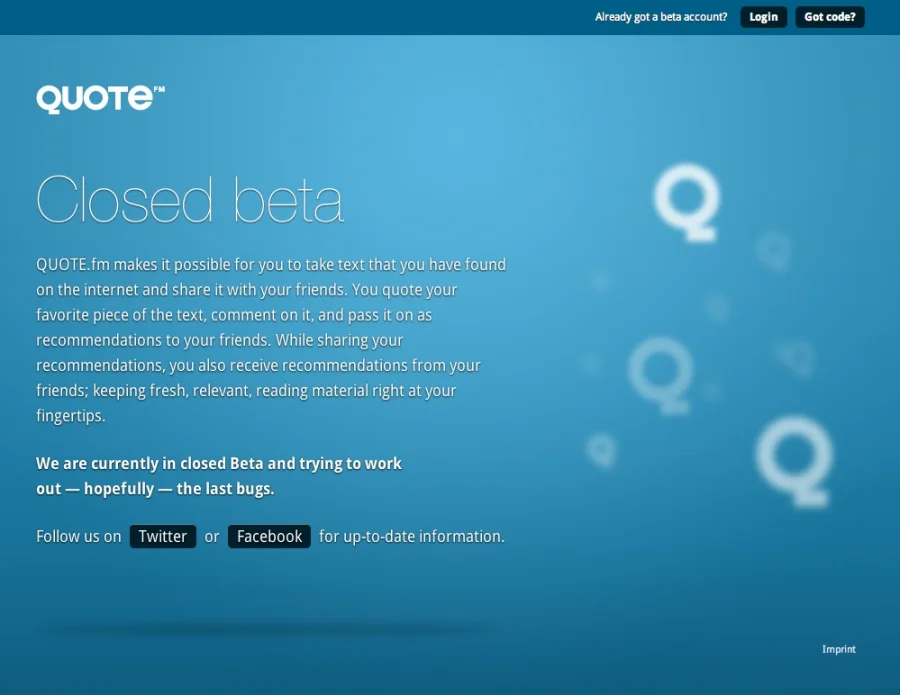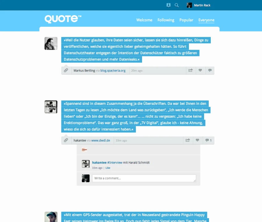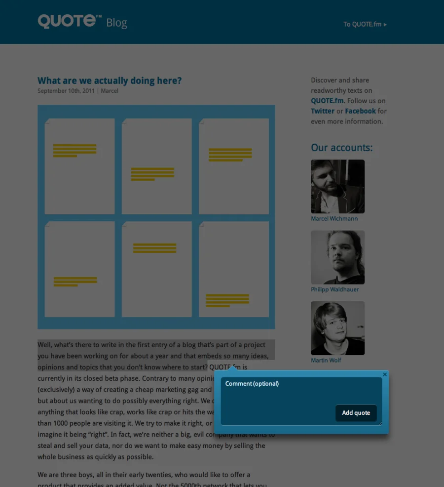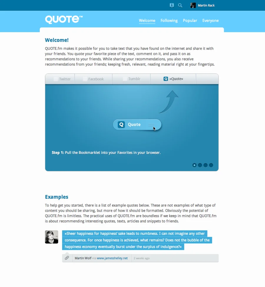 Quote.fm makes it possible for you to take text that you have found on the internet and share it with your friends. You quote your favorite piece of the text, comment on it, and pass it on as recommendations to your friends. While sharing your recommendations, you also receive recommendations from your friends; keeping fresh, relevant, reading material right at your fingertips.