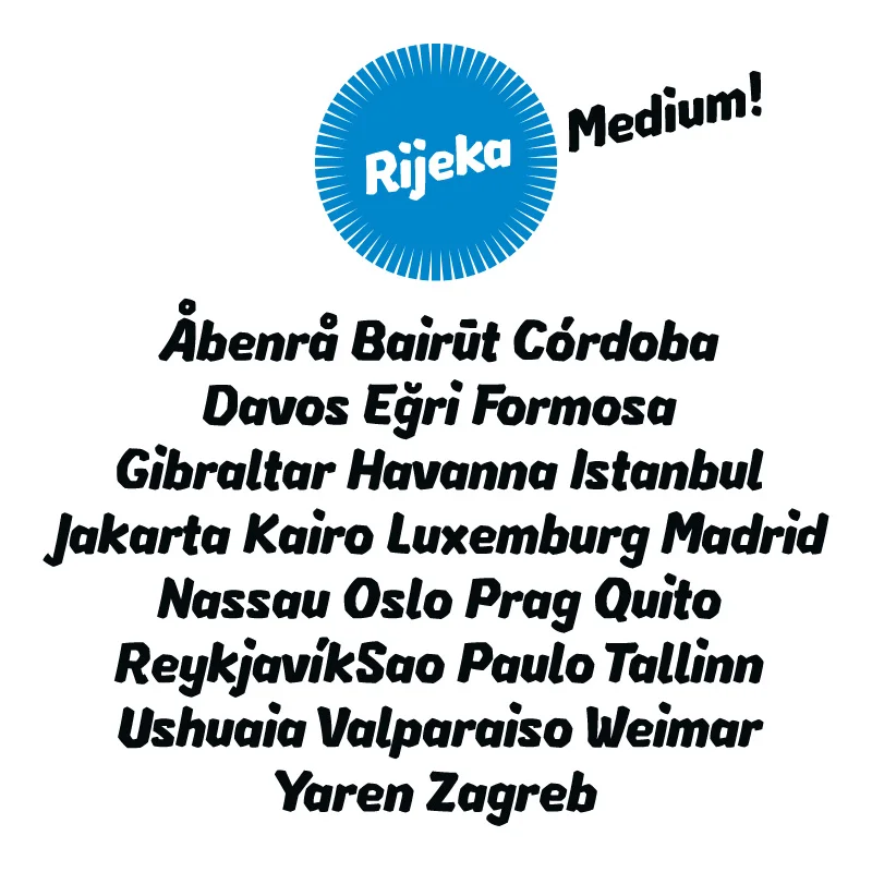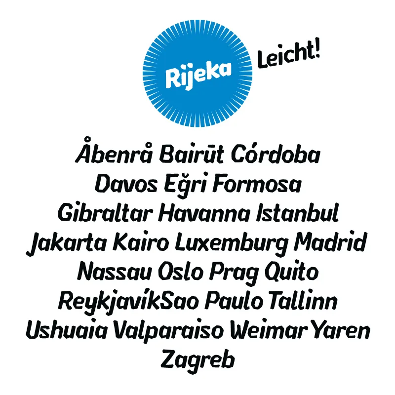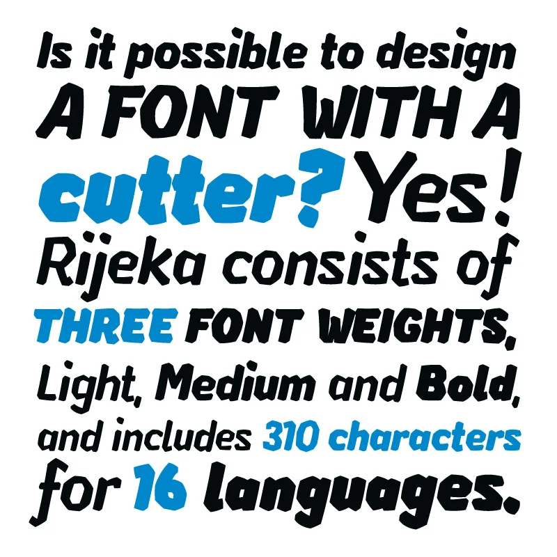 Ist es möglich, eine Schrift mit dem Cutter zu gestalten? Ja! Rijeka besteht aus drei Schriftschnitten: leicht, medium, bold und hat 310 Zeichen für 16 Sprachen. Luzi Gantenbein gestaltete die Schriftfamilie an der Hochschule der Künste Bern.