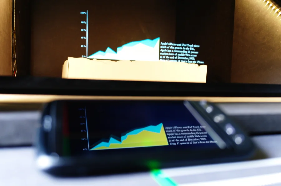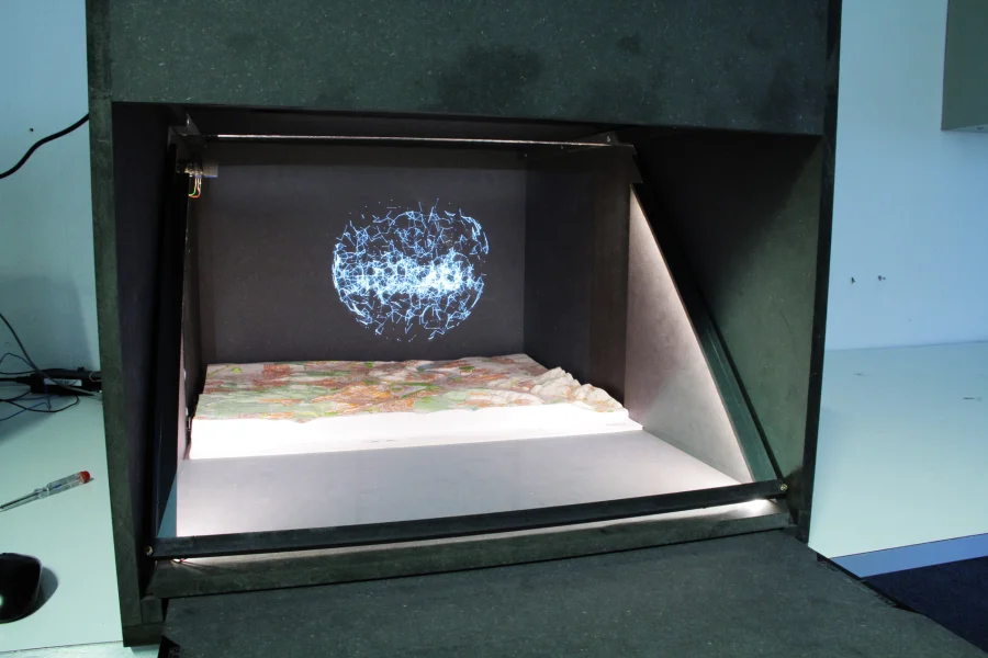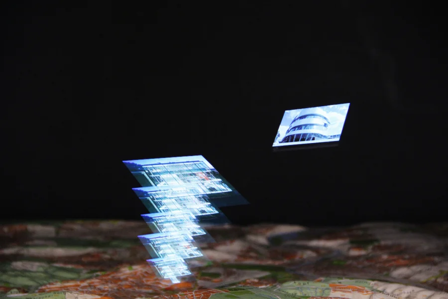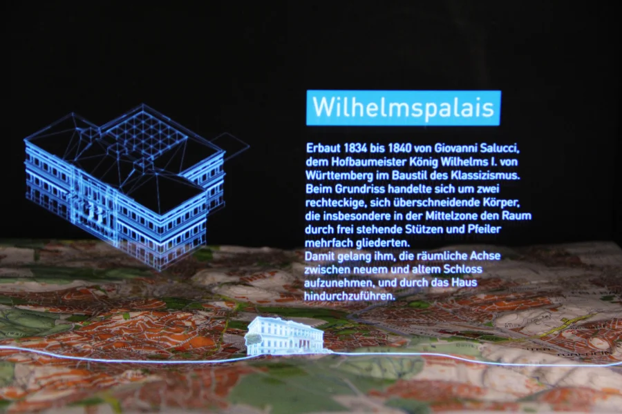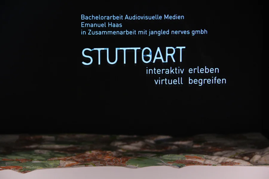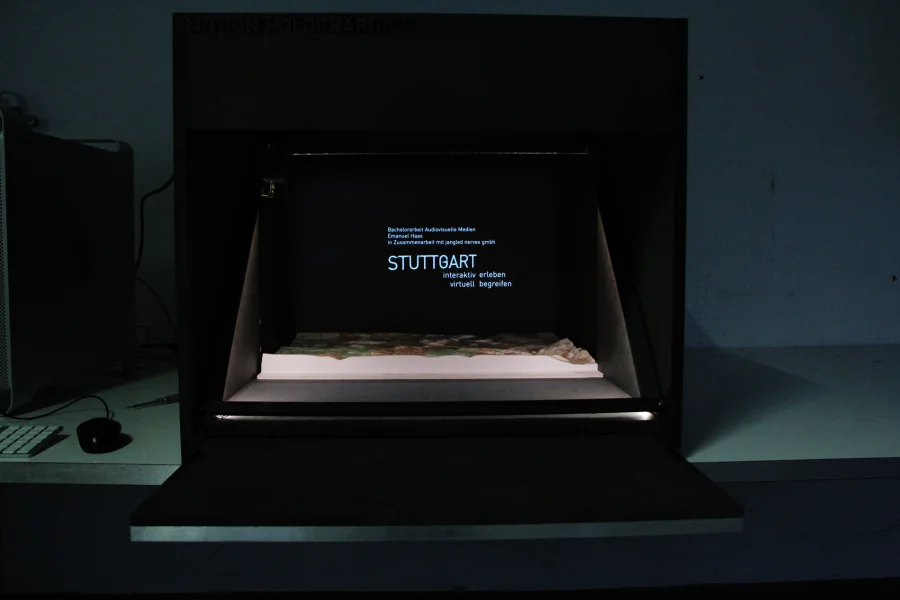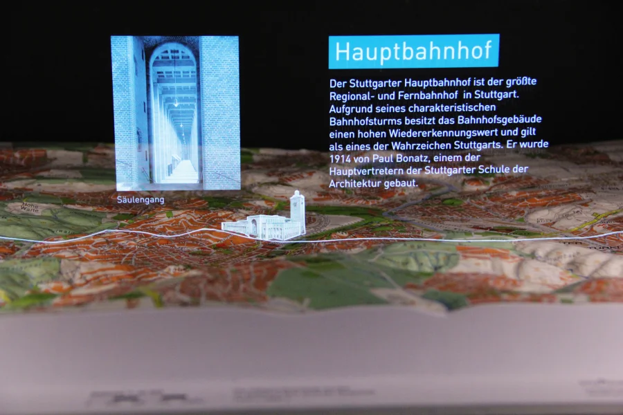 Verschiebe einen teildurchlässigen Spiegel in einem holografischen Schaukasten und erfahre so mehr über bedeutungsvolle Bauwerke und Wahrzeichen in Stuttgart. Diese Erneuerung des Bühnentricks namens “Pepper’s Ghost Effect” bringt interaktive Animationen und Datenvisualisierungen mit sich. Durch die Möglichkeit der physischen Interaktion mit dem Schaukasten und der damit verbundenen Steuerung der virtuellen Inhalte wurde eine multimediale Installation für Museen und Austellungen geschaffen.