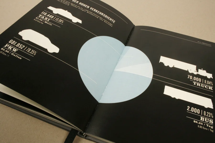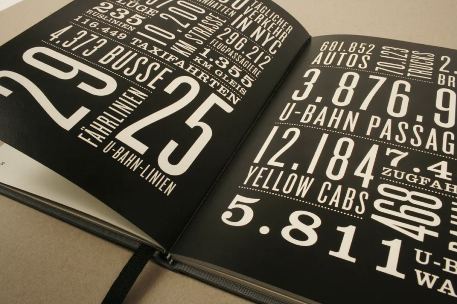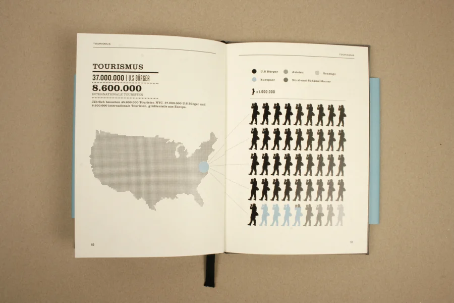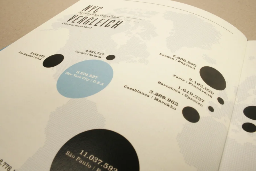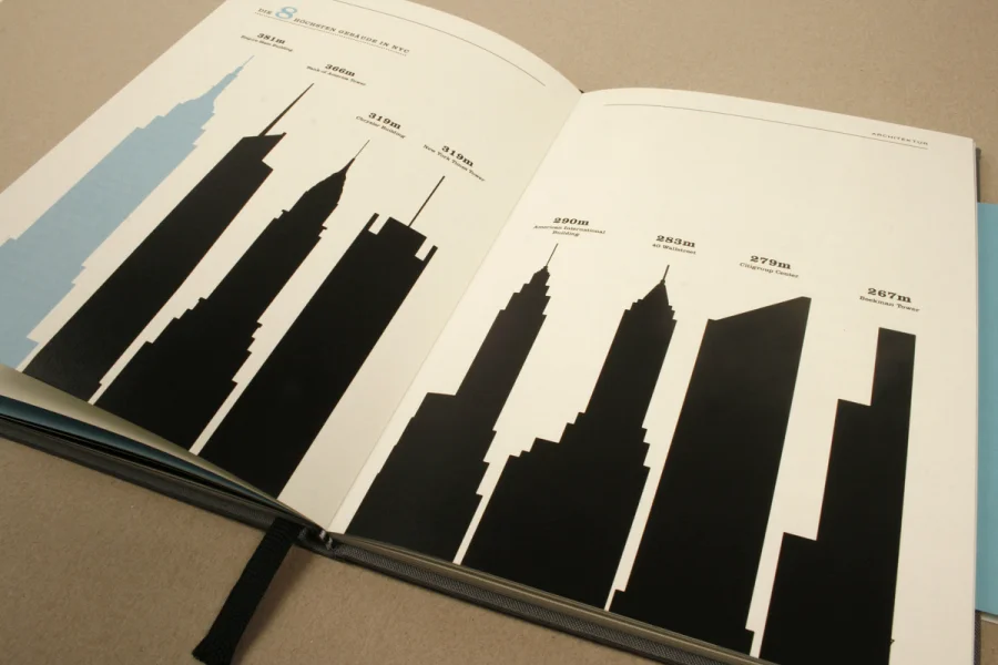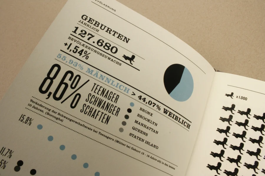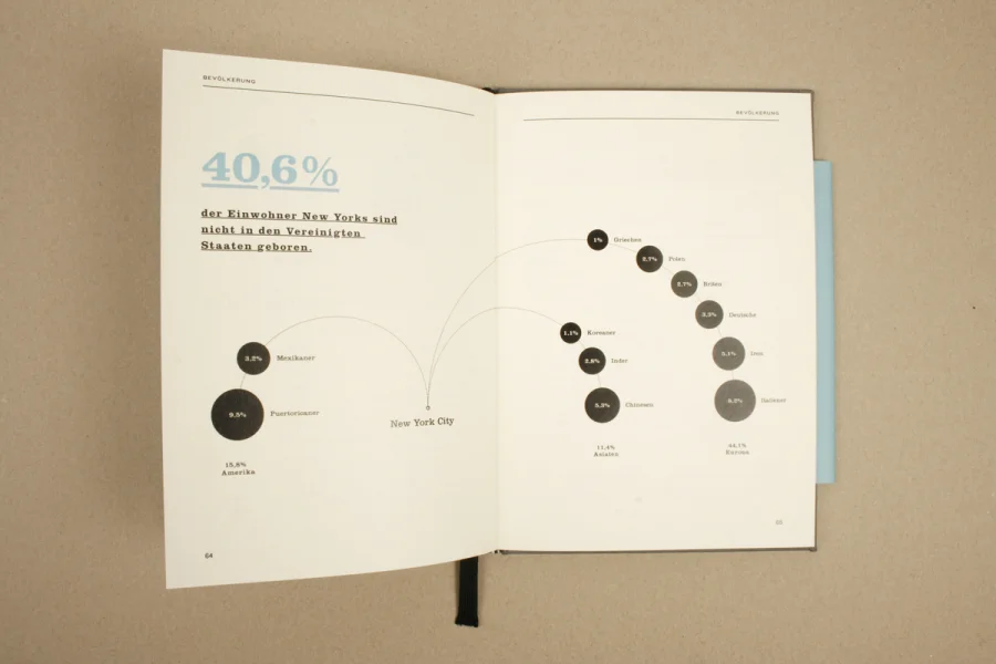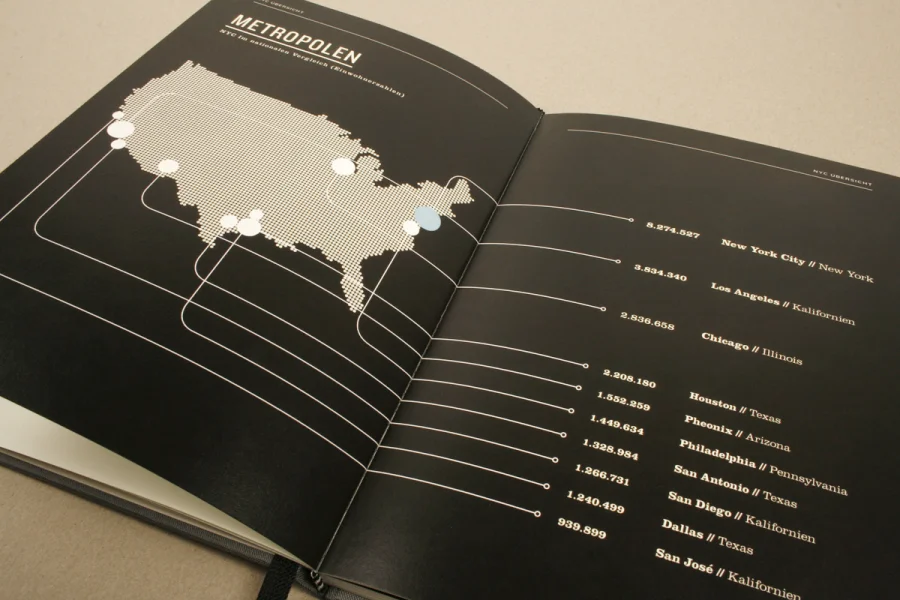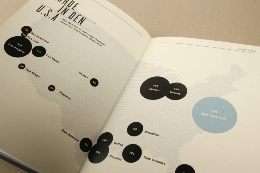 Die Arbeit Urbanes Wissen beinhaltet beeindruckende Zahlen und wissenswerte Fakten zu der Megametropole New York City. Basierend auf den Extremen und Kontrasten der Großstadt wurden Statistiken und Details zu Themen wie Kriminalität, Finanzen, Bevölkerung, Bildungswesen, Infrastruktur etc. grafisch umgesetzt und in einem Buch zusammengefasst.