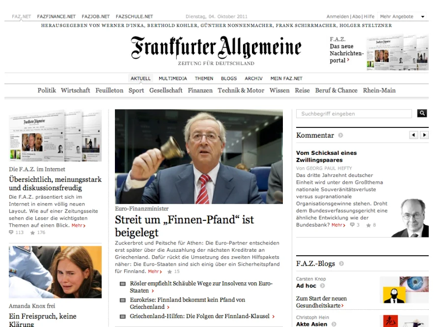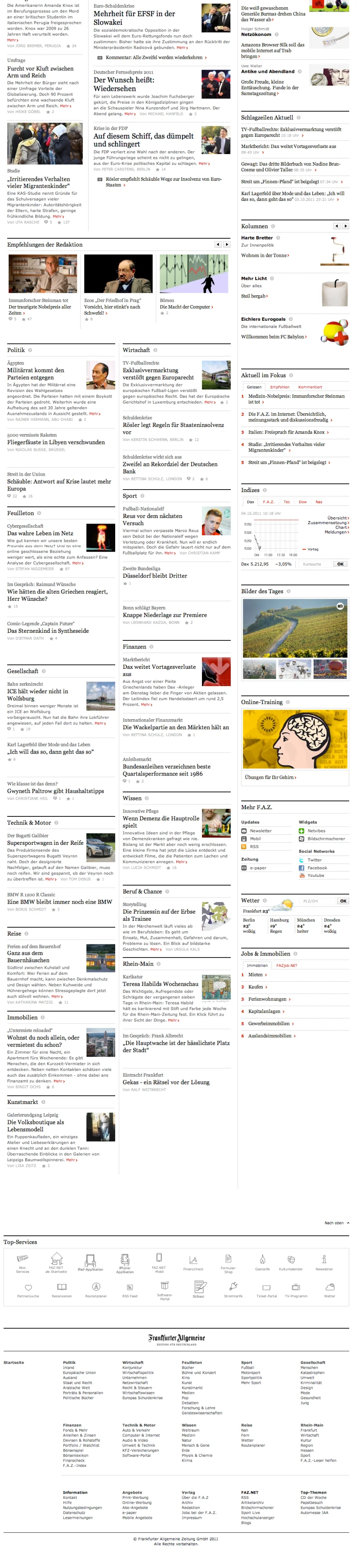 “Die F.A.Z. präsentiert sich im Internet in einem völlig neuen Layout. Wie auf einer Zeitungsseite sehen die Leser die wichtigsten Themen auf einen Blick.”