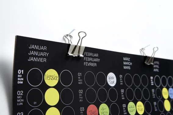 Dieser Wandkalender lässt sich individuell nach den Wünschen des Nutzers einrichten – mit praktischen, beschreibbaren Klebepunkten in fünf Farben. So kann man Termine, Geburtstage, Feiertage und Ferien übersichtlich in den schlicht designten Kalender einfügen. Entweder auf der schwarzen oder der weißen Kalenderseite.
