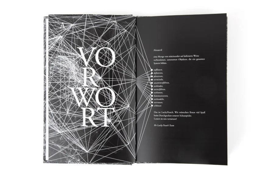 Für die Schauspiel-Agentur Lucky Punch entwickelte Rocket & Wink den neuen Herbst 2011 Katalog. Die Agentur bietet eine optimale Vernetzung mit der Branche. Diese Eigenschaft wurde mit Hilfe von farbigen Gummibändern, Vernetzungen und Infografiken konzeptionell und visuell aufgegriffen.