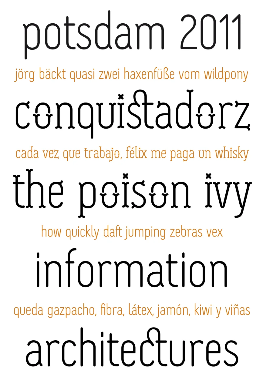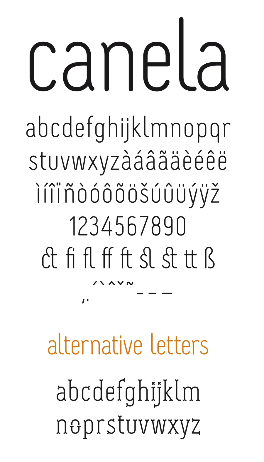 Canela, spanisch für Zimt, ist meine erste Schrift. Sie ist im Unterricht von Luc(as) de Groot an der Fachhochschule Potsdam entstanden und befindet sich noch im Arbeitsprozeß. Die Schrift zeichnet sich durch eine klare geometrische Gestaltung und schwache Kontraste aus. Sie besizt einen Alternativschnitt, durch den sie lebendiger und verspielter wird.