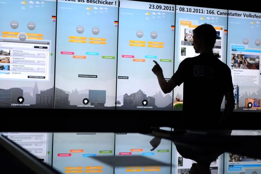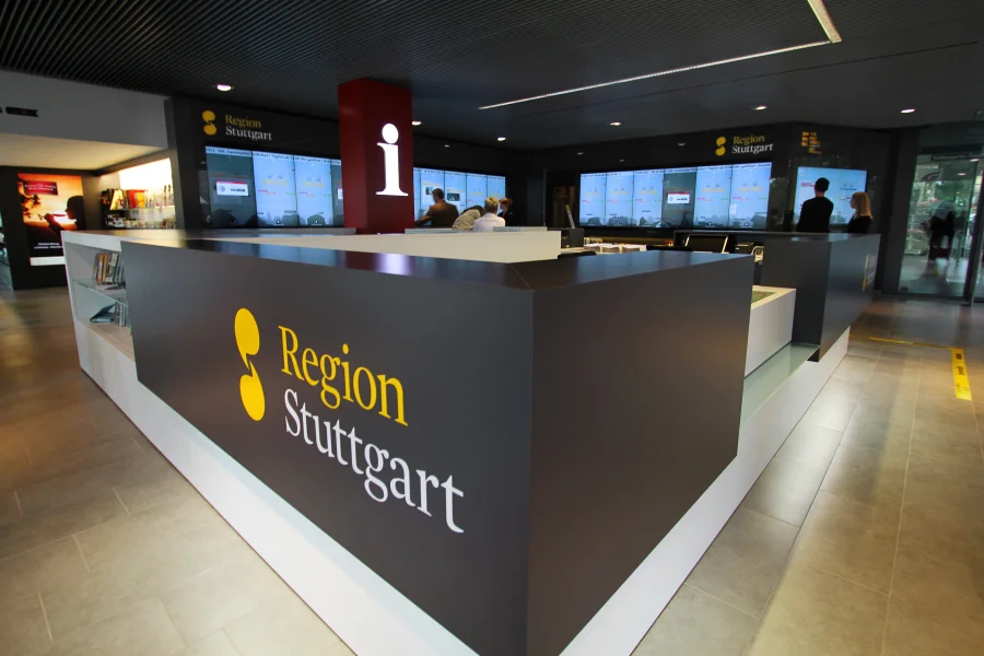 Eine fast zehn Meter lange Wand bestehend aus 16 Touchscreens, auf denen sich mehrere Besucher gleichzeitig über das touristische Angebot der Region Stuttgart informieren können. Die Bedienung der Regiowall geschieht auf intuitive Weise durch das Berühren des Displays mit den Fingern. Die Touchscreens entsprechen dem neuesten Stand der Technik. Das Touchsystem ist eine Spezialanfertigung auf Infrarot-Basis, das mehrere Finger und Hände gleichzeitig erfasst. Somit ist eine Bedienung durch mehrere Benutzer, die unterschiedliche Gesten simultan ausführen, möglich. Die Besucher können sich aus dem großen Datenpool interessante Inhalte in einer virtuellen Merkliste speichern und diese mithilfe von QR-Codes auf das eigene Smartphone übertragen. Wer kein Smartphone zur Verfügung hat, kann sich die Merkliste auch am Serviceschalter ausdrucken.