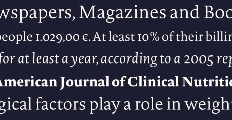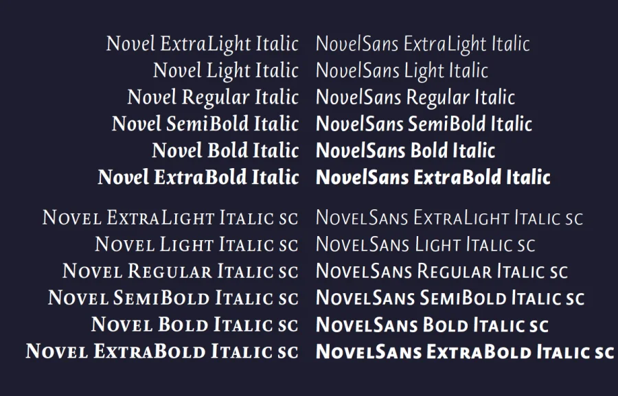 Novel Sans verfürgt über eine schmaler laufende und fast aufrechte Italic, mit der besonders angenehme Hervorhebungen im Text gemacht werden können. Durch diese kalligrafische Raffinesse lässt sich ein schöner Kontrast zur Roman erzeugen und ein harmonisches, aber dennoch belebtes Schriftbild erzielen.