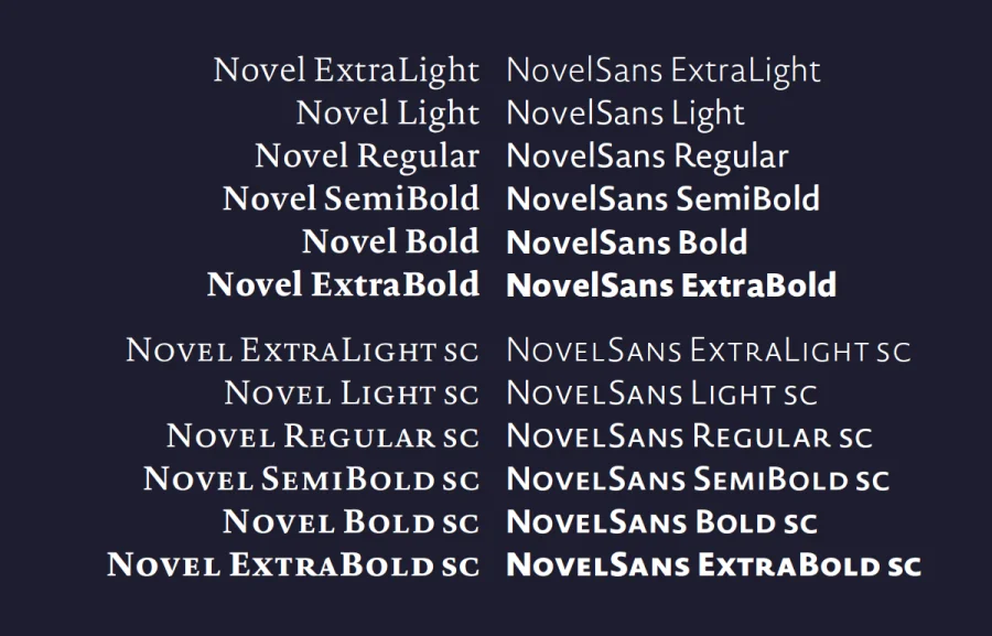Novel Sans ist die passende Serifenlose zur Antiqua Schriftfamilie Novel.